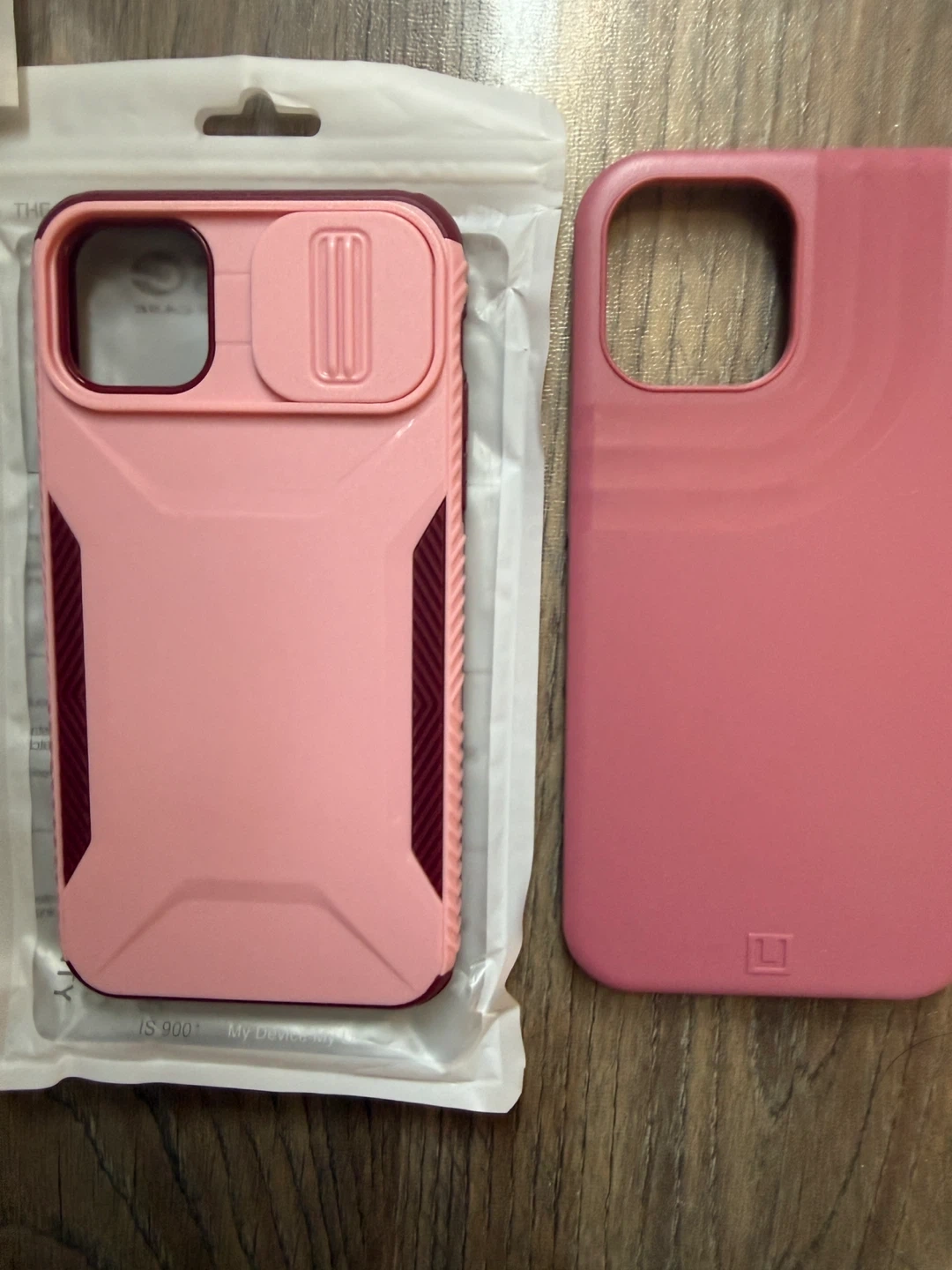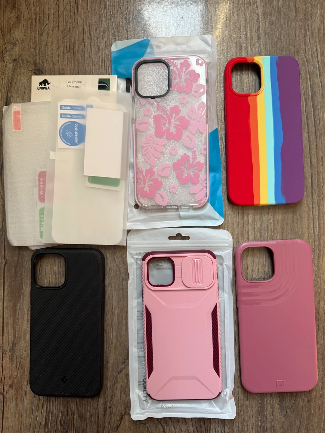 Selling a bundle of five phone cases for an iPhone 12 Pro Max. Includes a clear floral case, a rainbow striped silicone case, a black textured case, a pink protective case with camera cover, and a pink solid case. Screen protector kit also included with guide stickers and wipes.