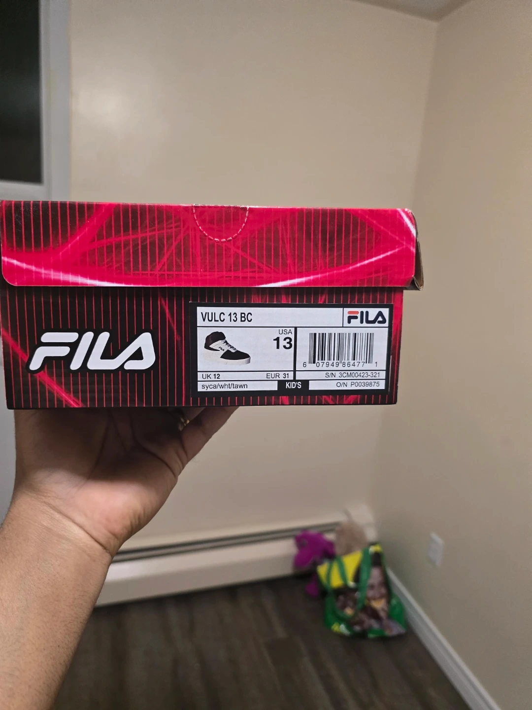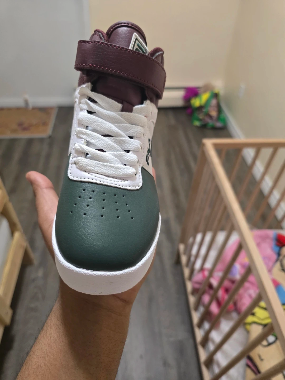 Fila VULC 13 BC mid-top shoes for kids. Colourway is syca/wht/lawn. These shoes have a velcro strap and lace-up closure. The size is a Kids' 13.