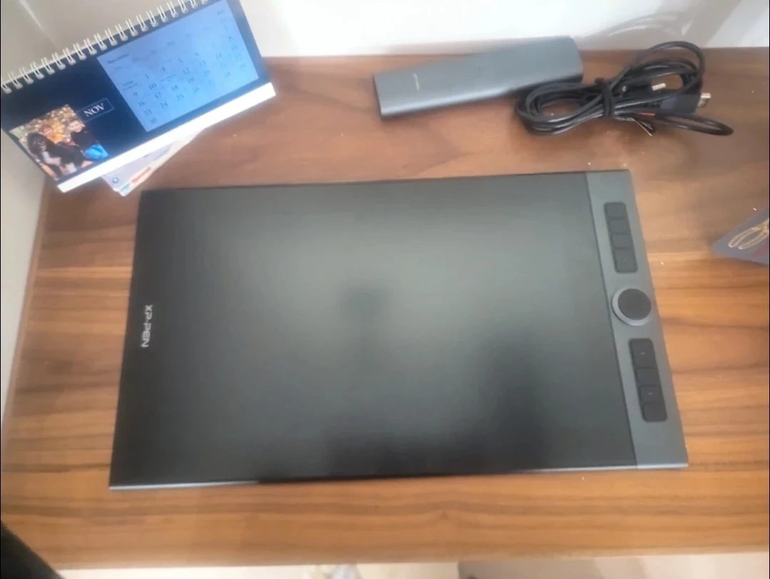 XP-PEN digital graphics drawing tablet and stylus included. It has express keys and a dial for shortcuts. Comes with its charging cable and storage case for the pen. ! No damage and works perfectly but has a little bit of residue from old stickers. Original price 700