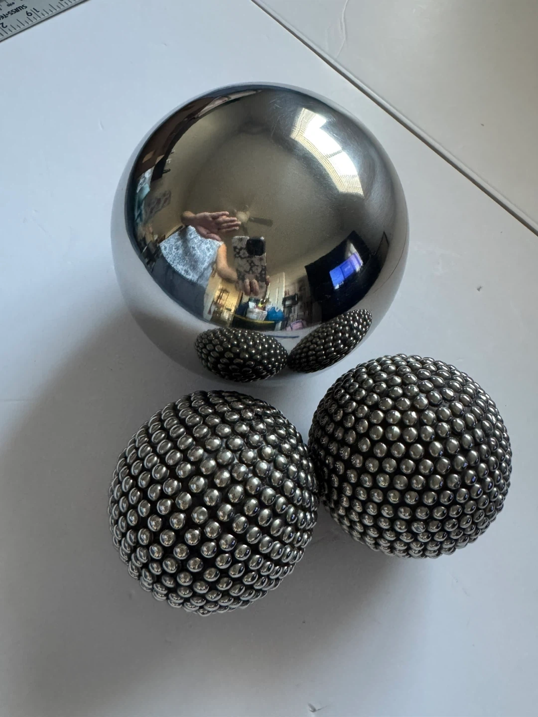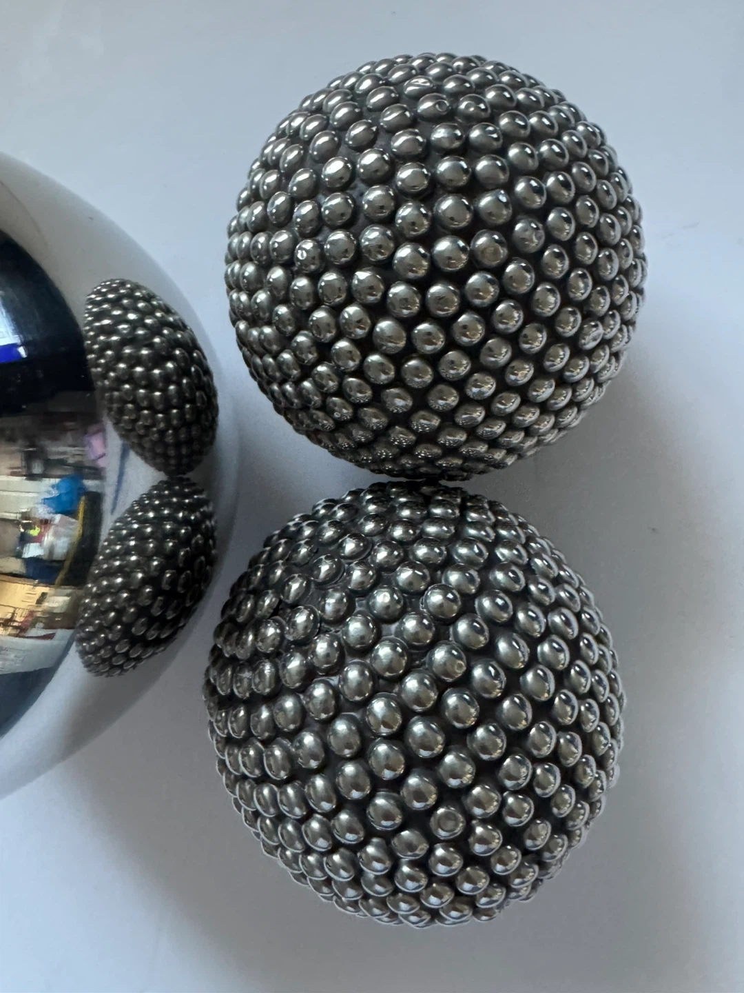This set includes one large, smooth silver sphere and two smaller spheres covered in silver beads. They're made of metal and would add a modern touch to any decor. CARB P1 compliant sticker is visible on the underside of the large sphere.