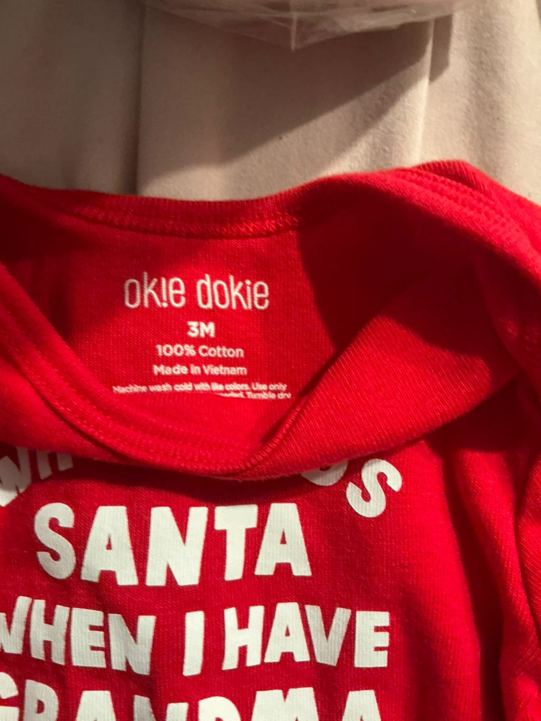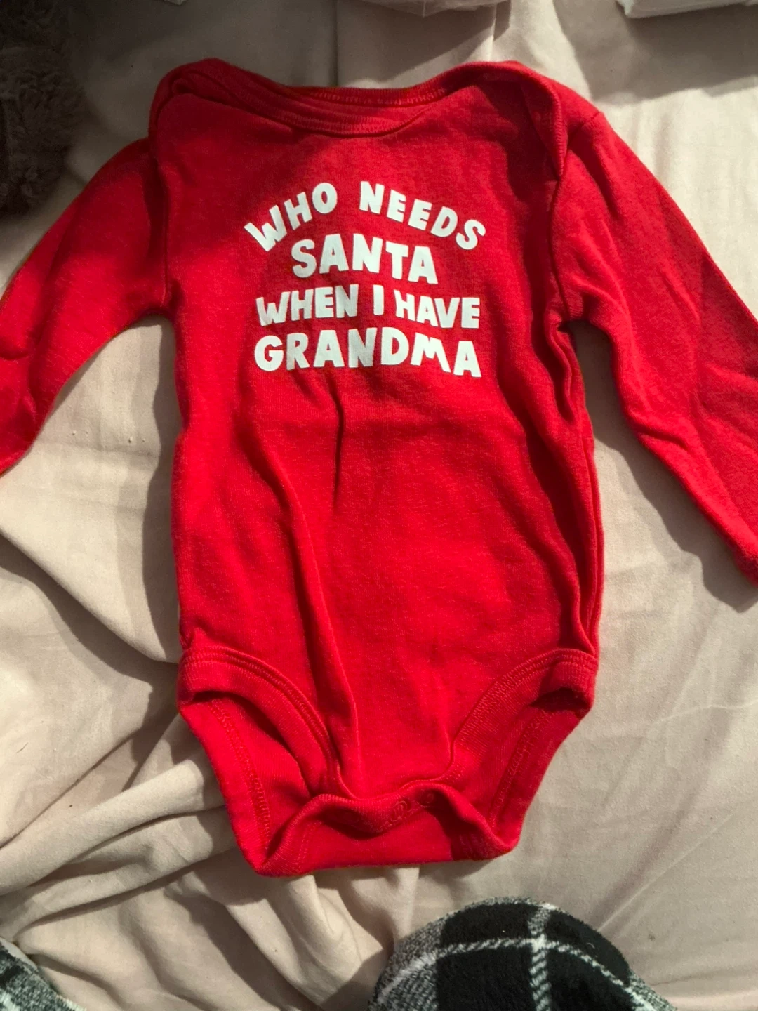 Red long-sleeve baby bodysuit. Features the text "Who Needs Santa When I Have Grandma". Made from 100% cotton. Size is 3 months. Pick up Downtown Victoria