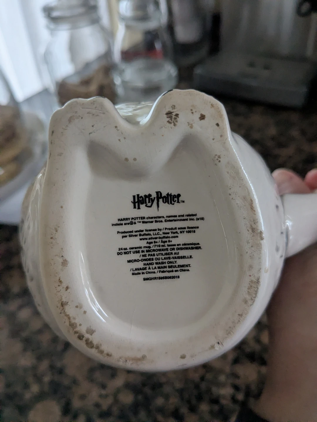 White ceramic mug featuring Harry Potter's owl, Hedwig. It has the "Harry Potter" logo on one side and Hedwig's face on the front. Dishwasher and microwave safe. 24 oz capacity.