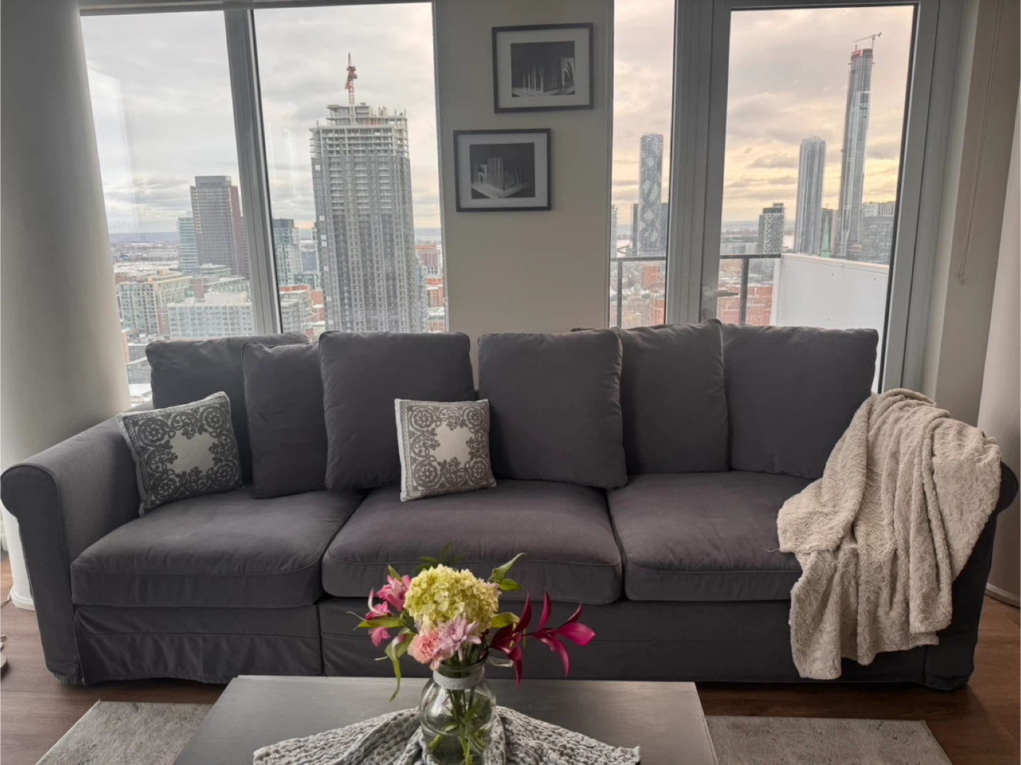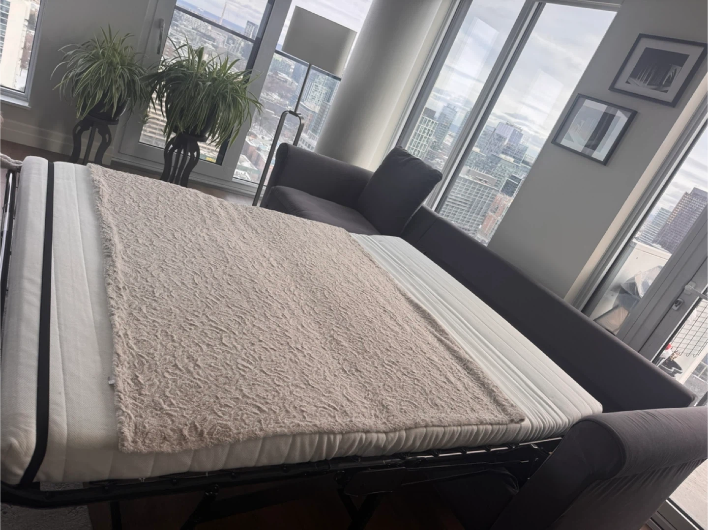This is a grey sofa that converts into a bed. It has a sturdy metal frame and a comfortable mattress. It's perfect for when you have overnight guests!