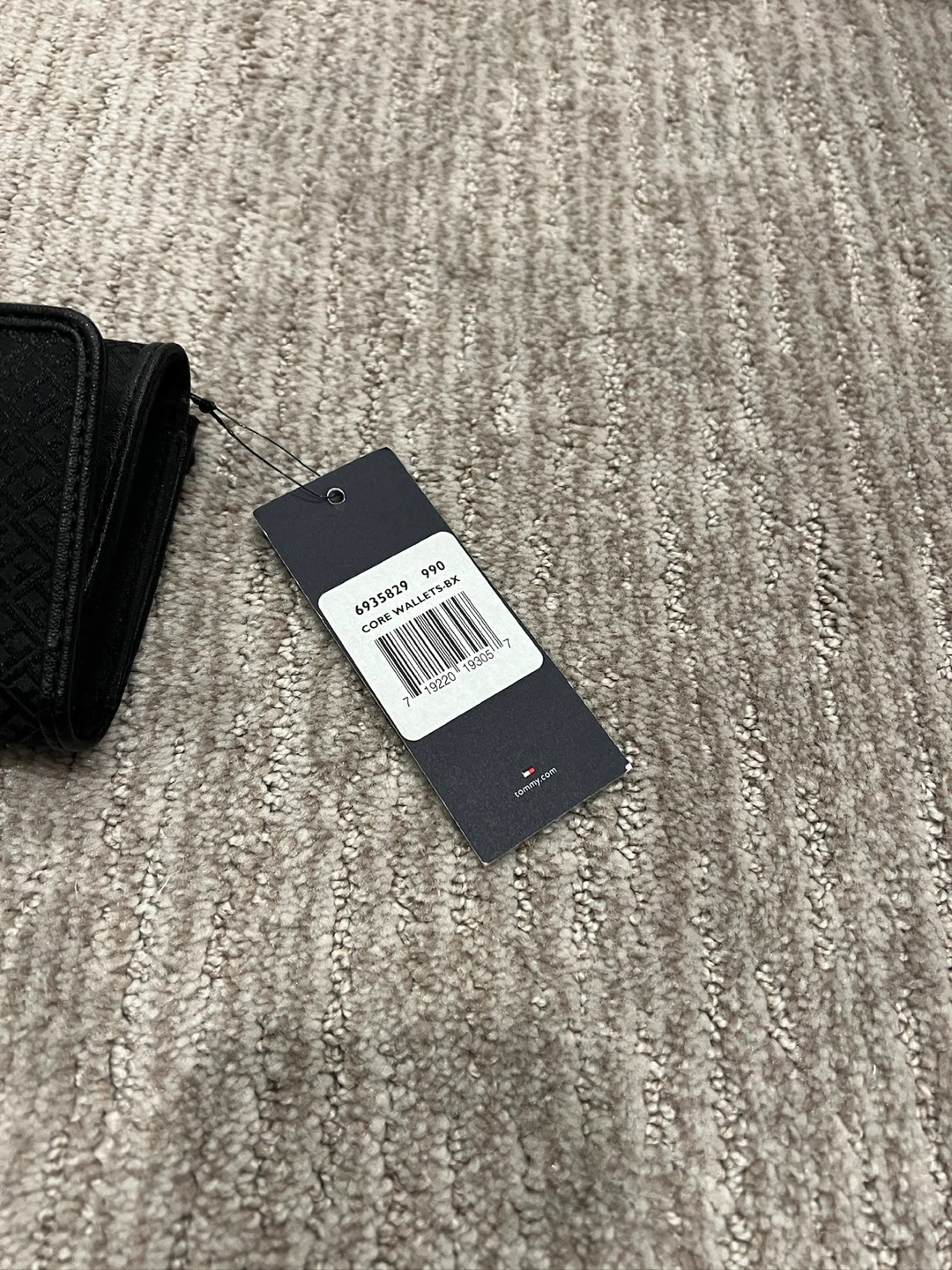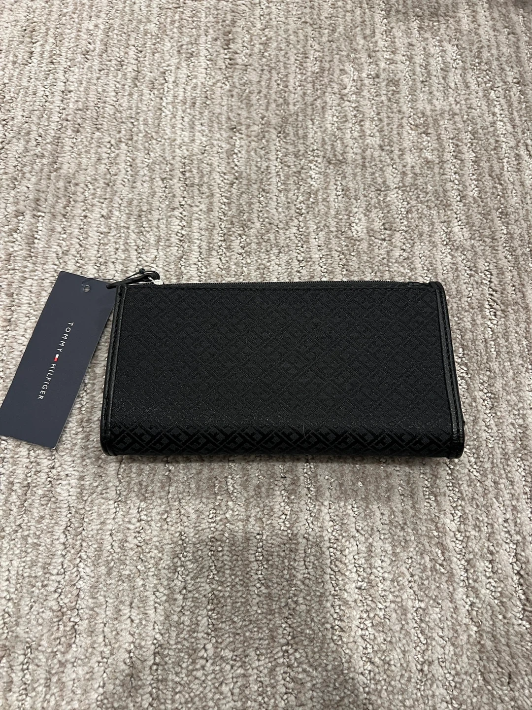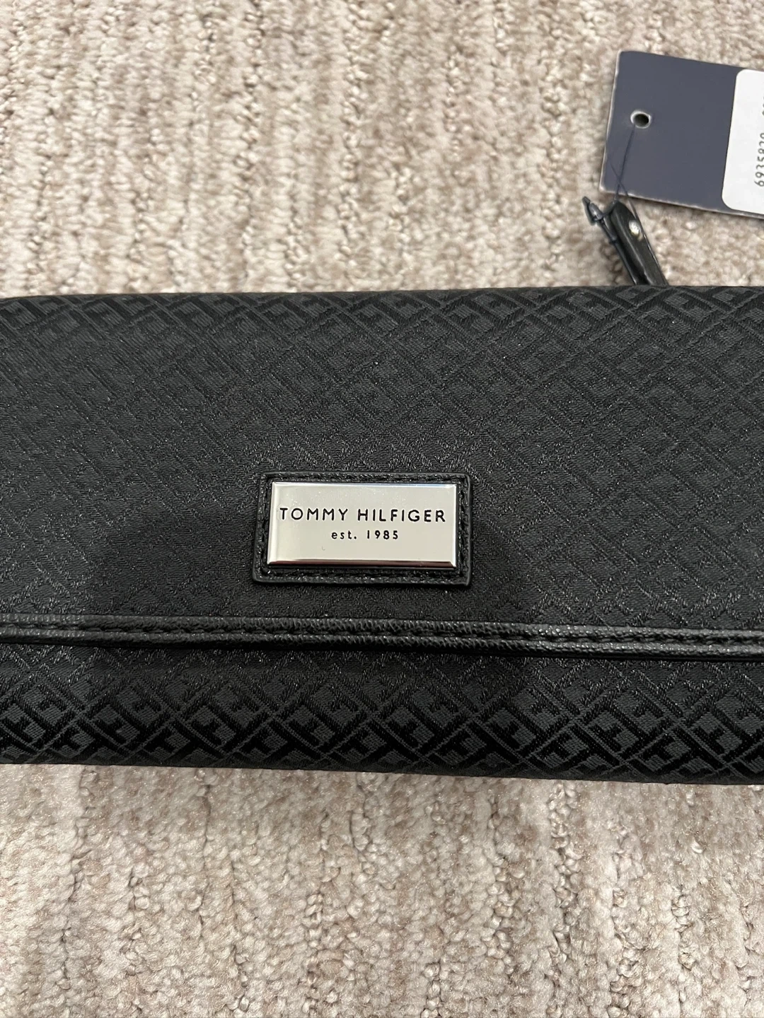 This is a black Tommy Hilfiger wallet. It has a patterned exterior and a silver-tone logo plate. The interior features card slots and a clear ID window. It's a bifold style.