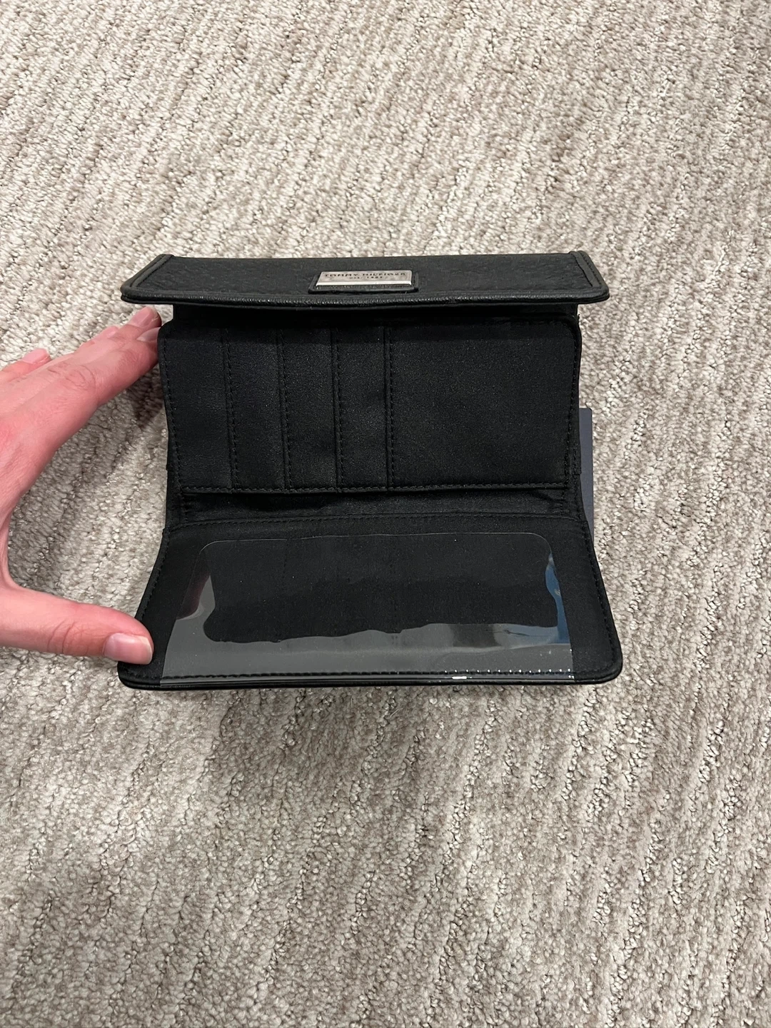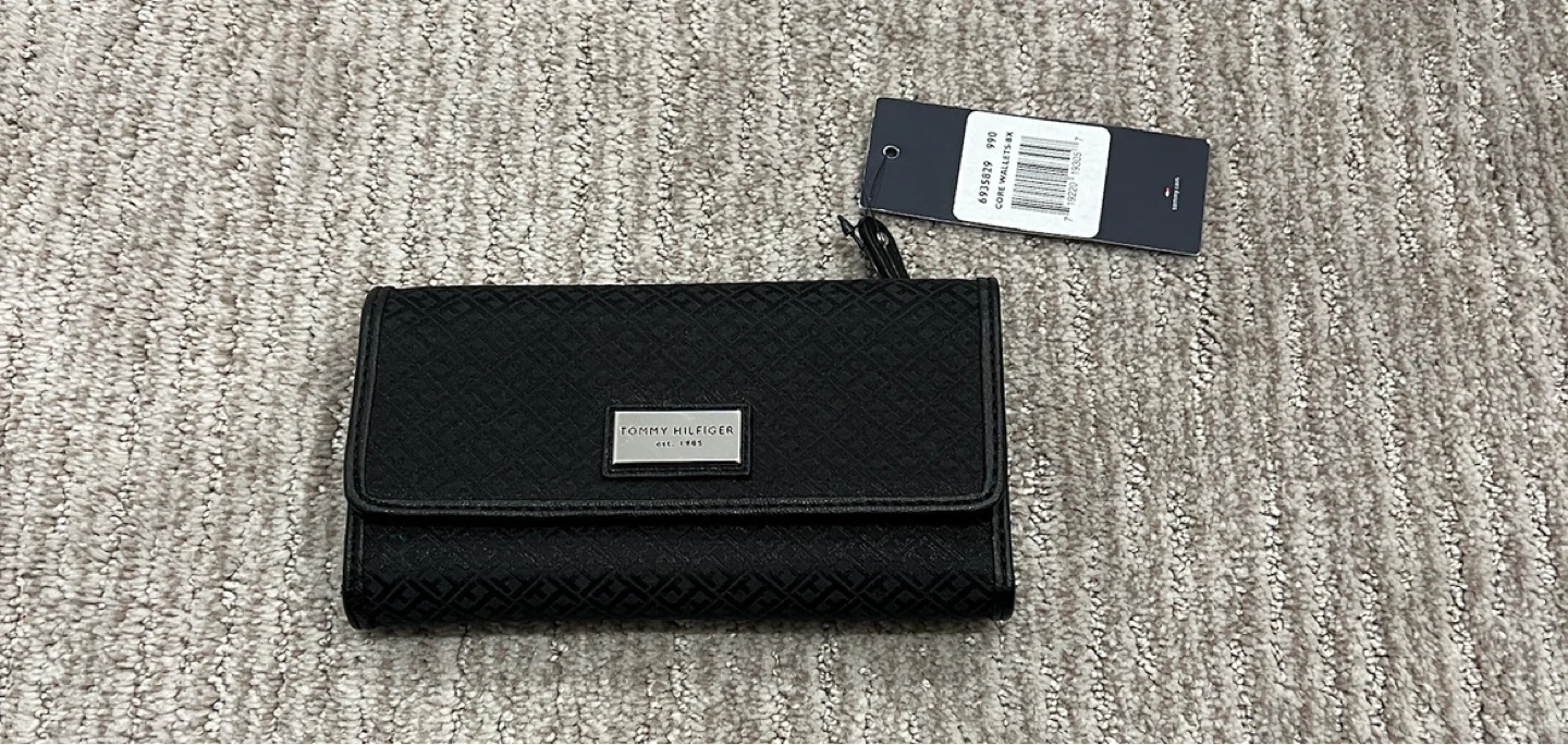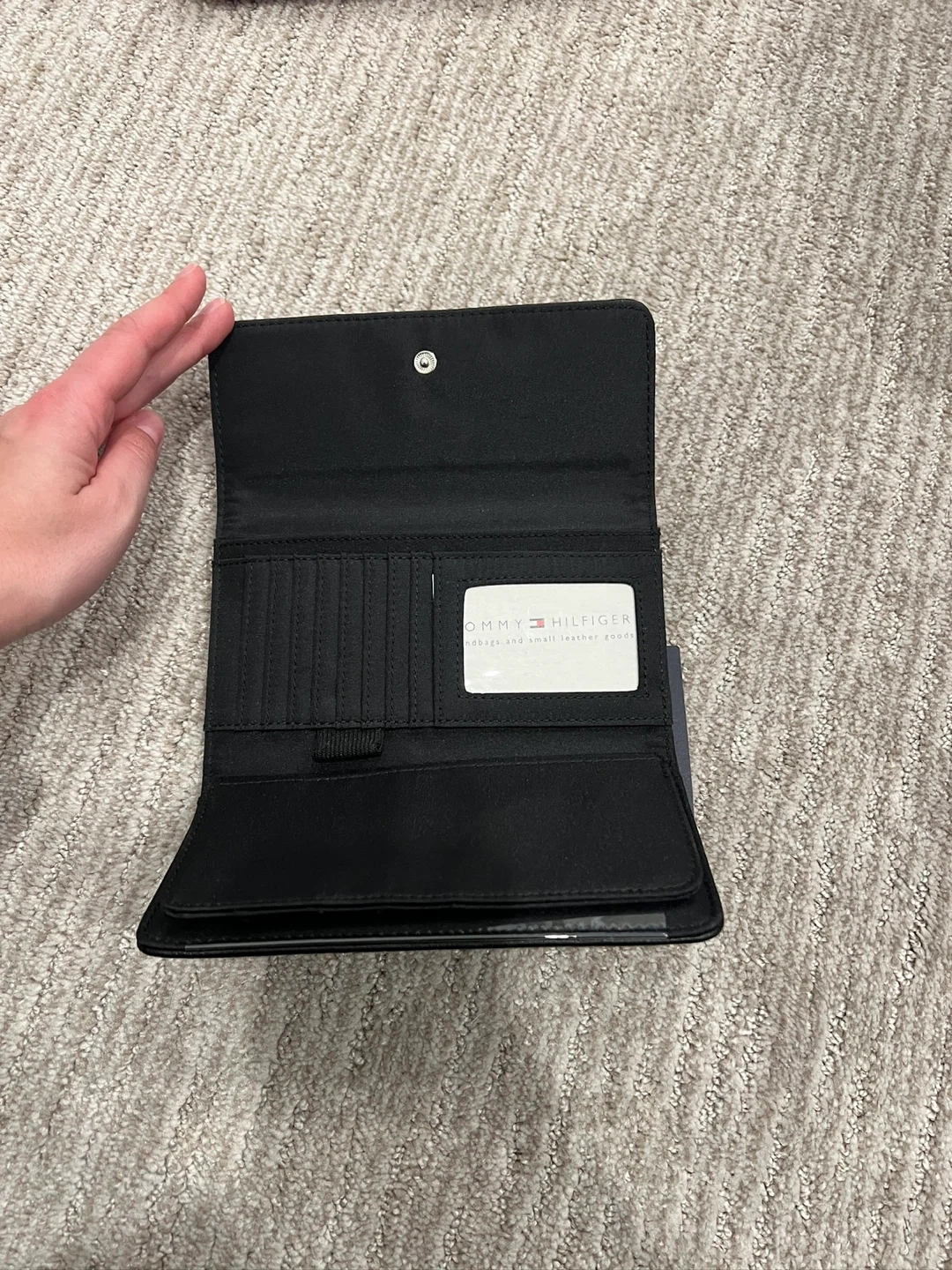 This is a black Tommy Hilfiger wallet. It has a patterned exterior and a silver-tone logo plate. The interior features card slots and a clear ID window. It's a bifold style.