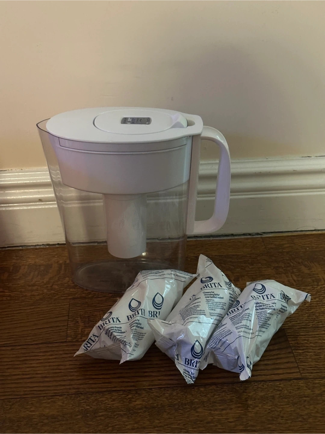 Small size Brita water filter pitcher comes with three new Brita replacement filters.