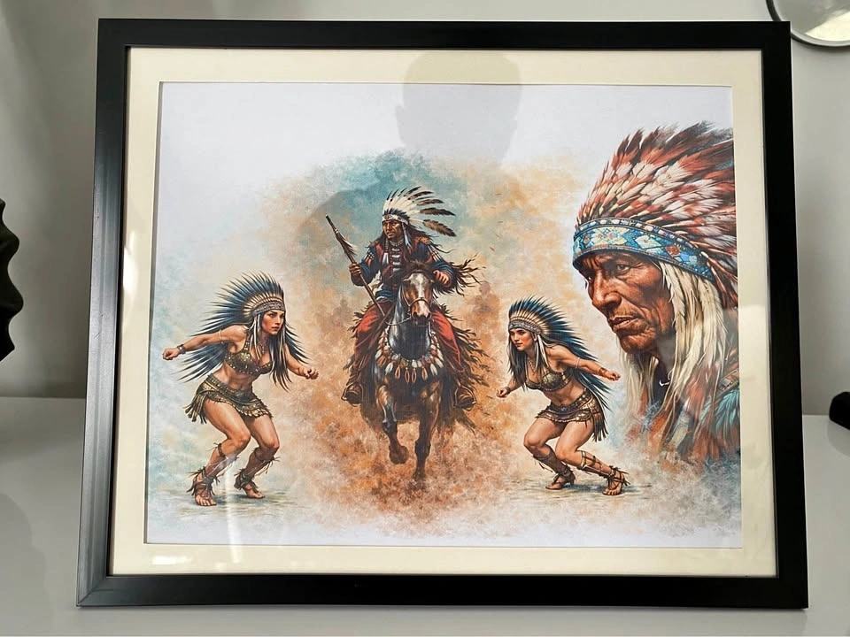 Beautiful framed artwork inspired by Indigenous culture and tradition, featuring powerful imagery of dancers, a warrior on horseback, and a detailed chief portrait. A striking piece that adds character and meaning to any space.