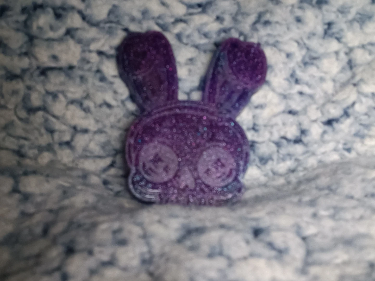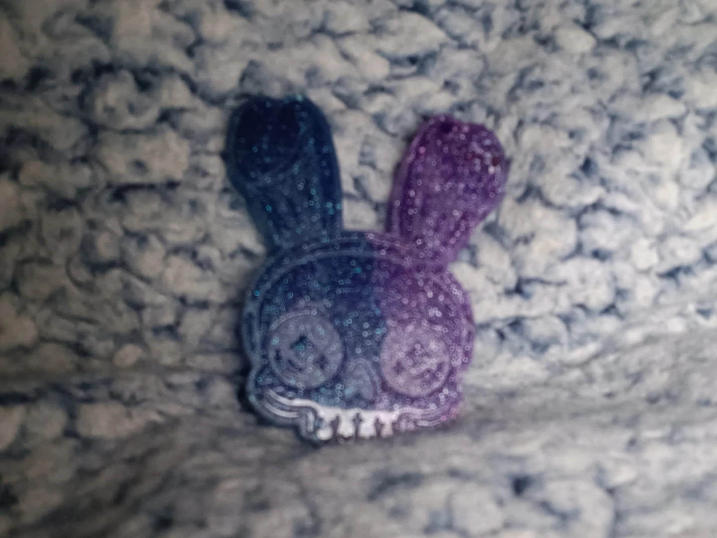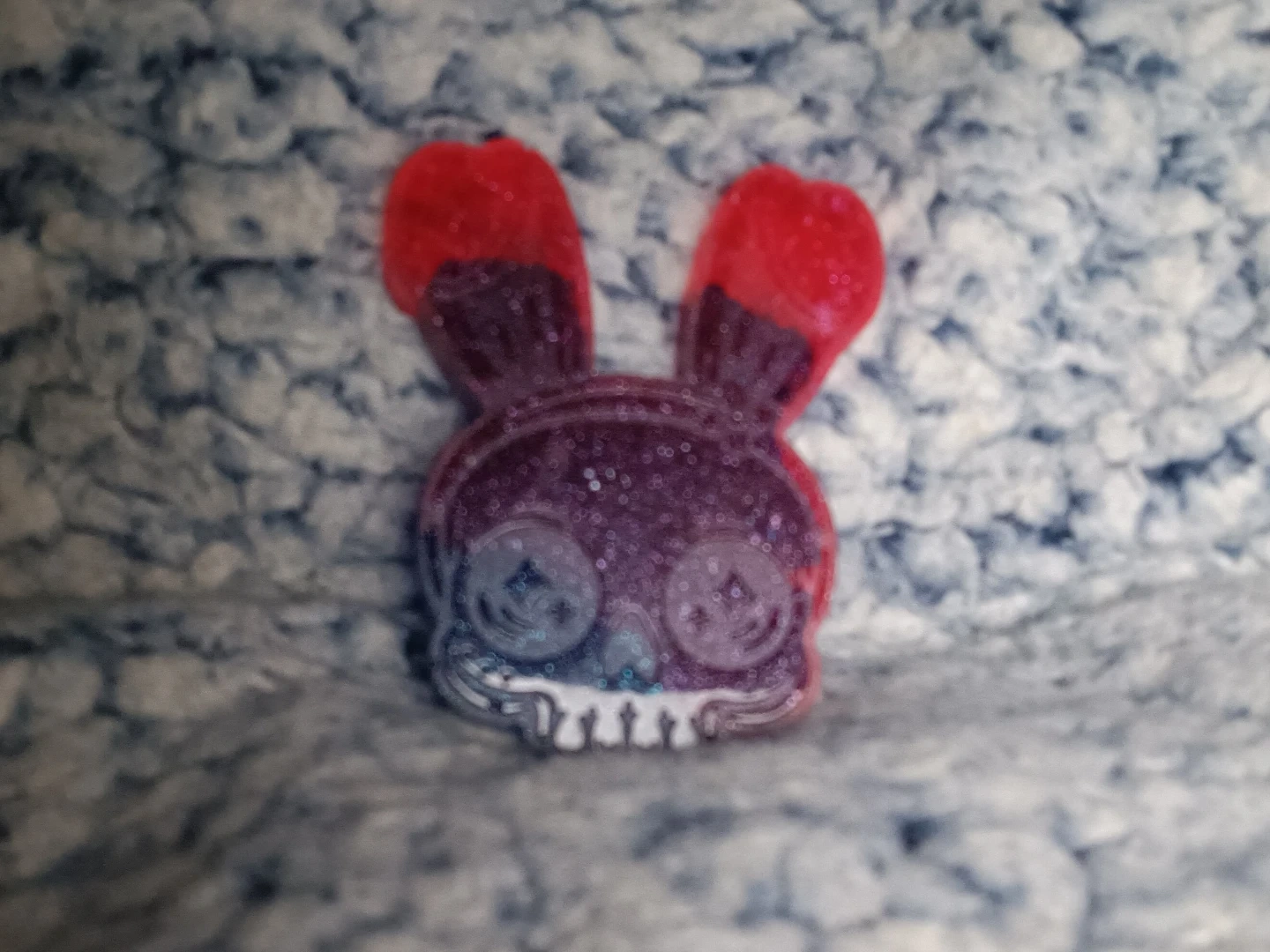 Handmade resin charms featuring a bunny skull design. Available in various sparkly colours including purple, pink, and red. These charms are great for crafts or as unique accessories!