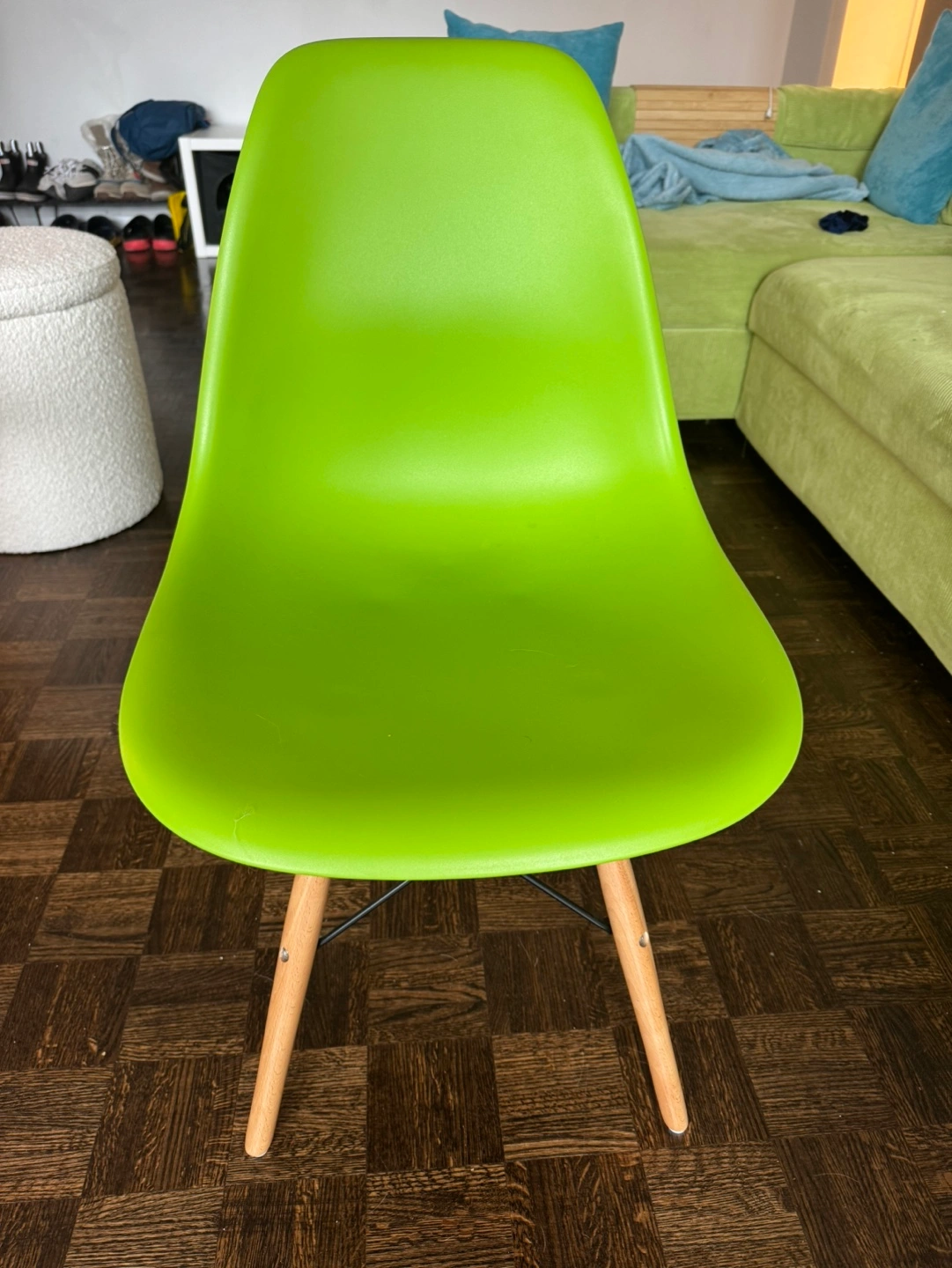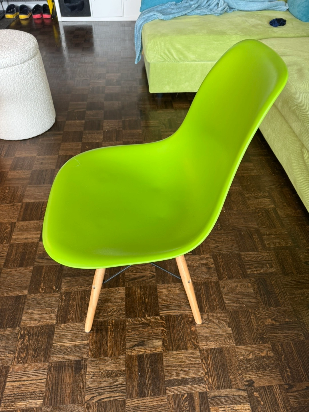Modern design chair. Retail price: $120. Lime green plastic seat and back. Wooden legs with black accents. Lightweight and easy to move.