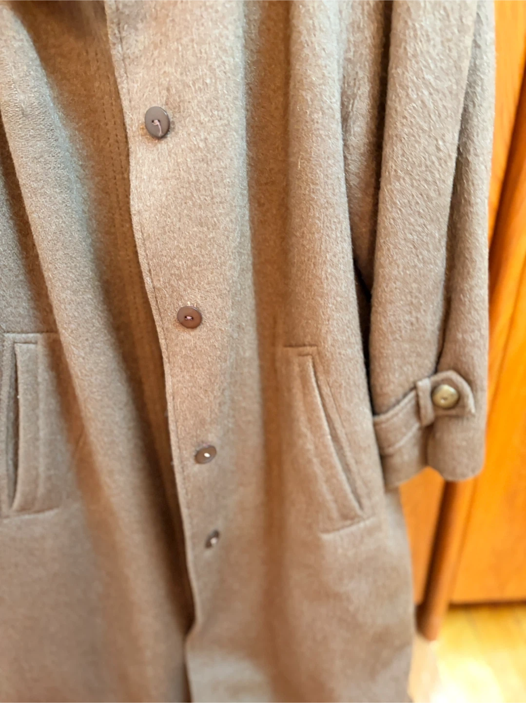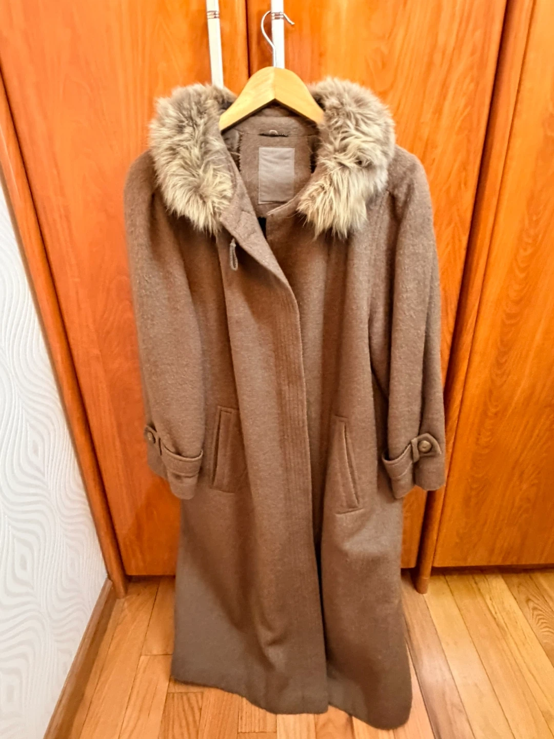 Terra brand long coat with a luxurious fur collar. It's made from an 80% alpaca and 20% wool blend. This coat offers a stylish and warm option for colder weather. Features button closure and two front pockets.