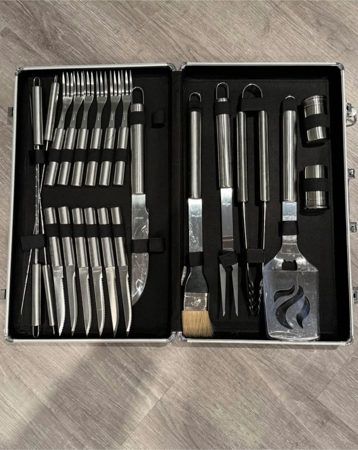 This 19-piece BBQ grill tool set includes everything you need for your next backyard cookout. It features durable stainless steel construction for all the utensils. The set comes in a convenient carrying case for easy storage and transport.
