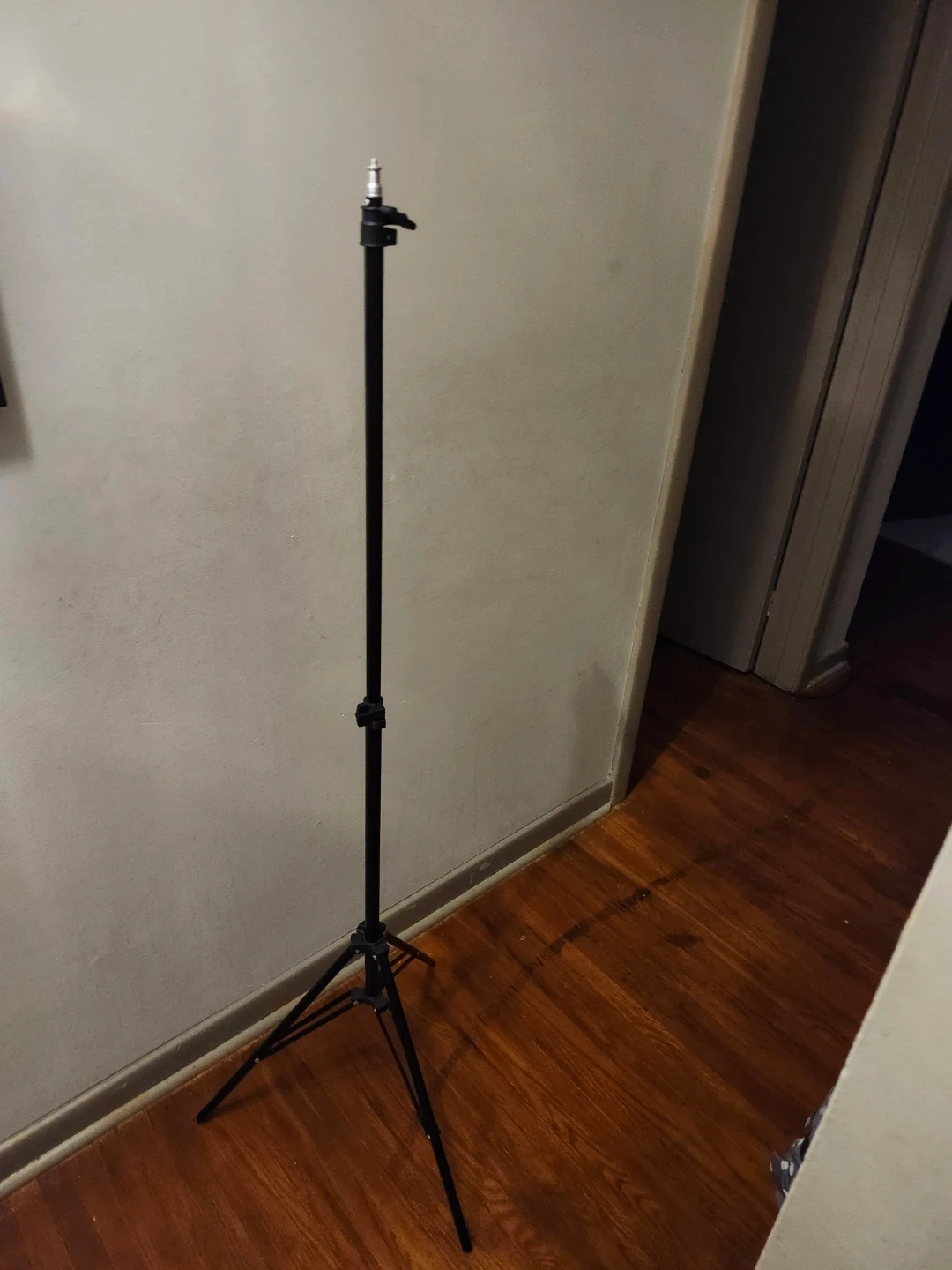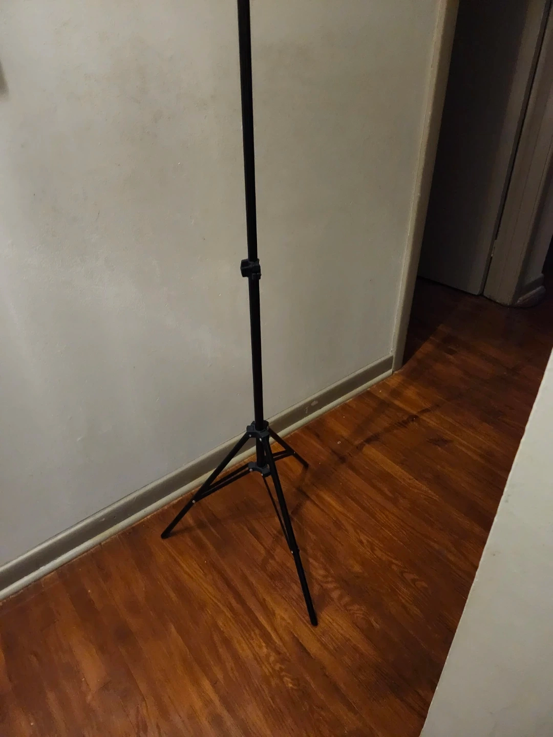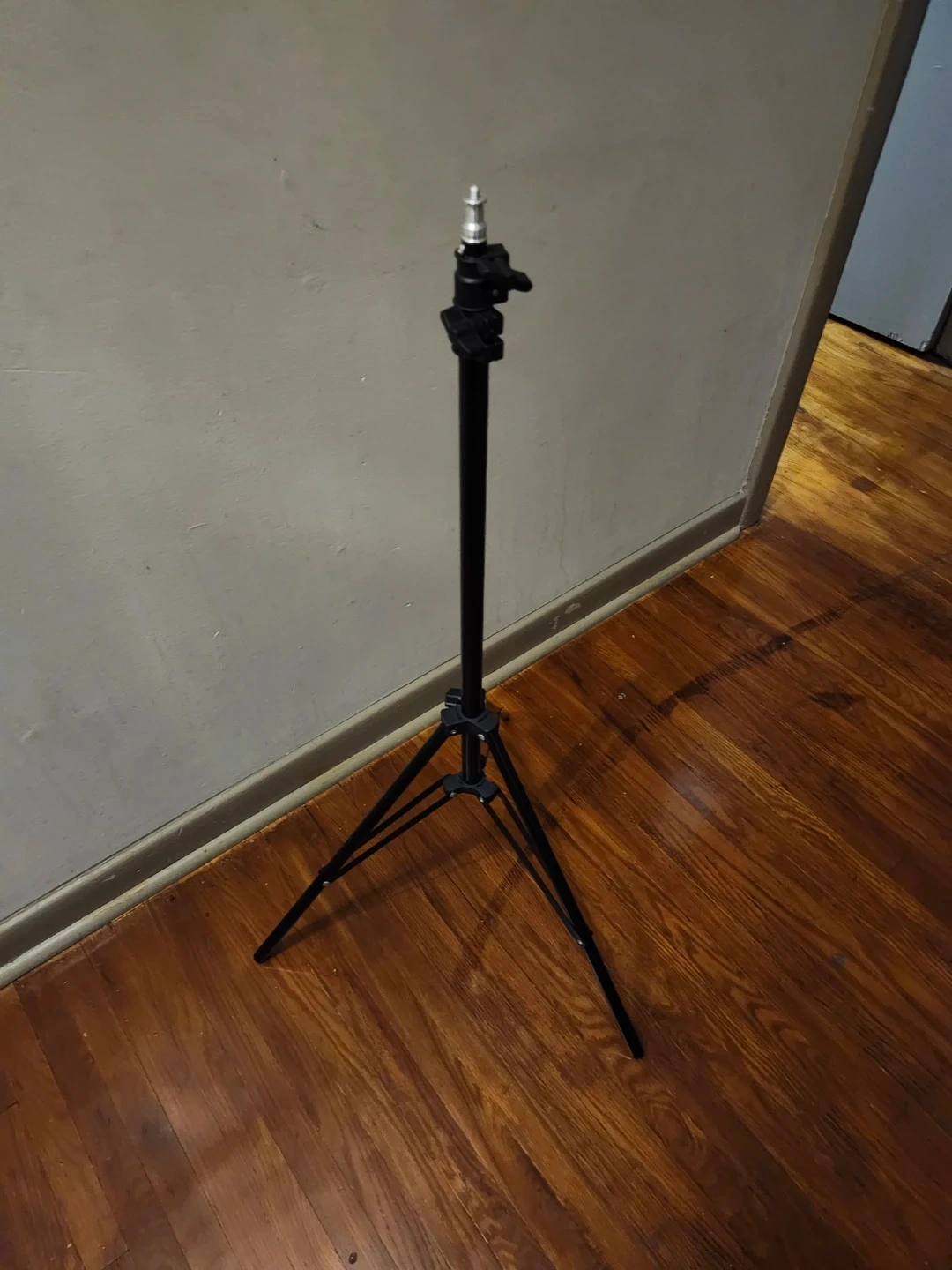 This is an adjustable stand with tripod base. It's made of black metal and features adjustable height settings. This stand is great for supporting studio lights or cameras.