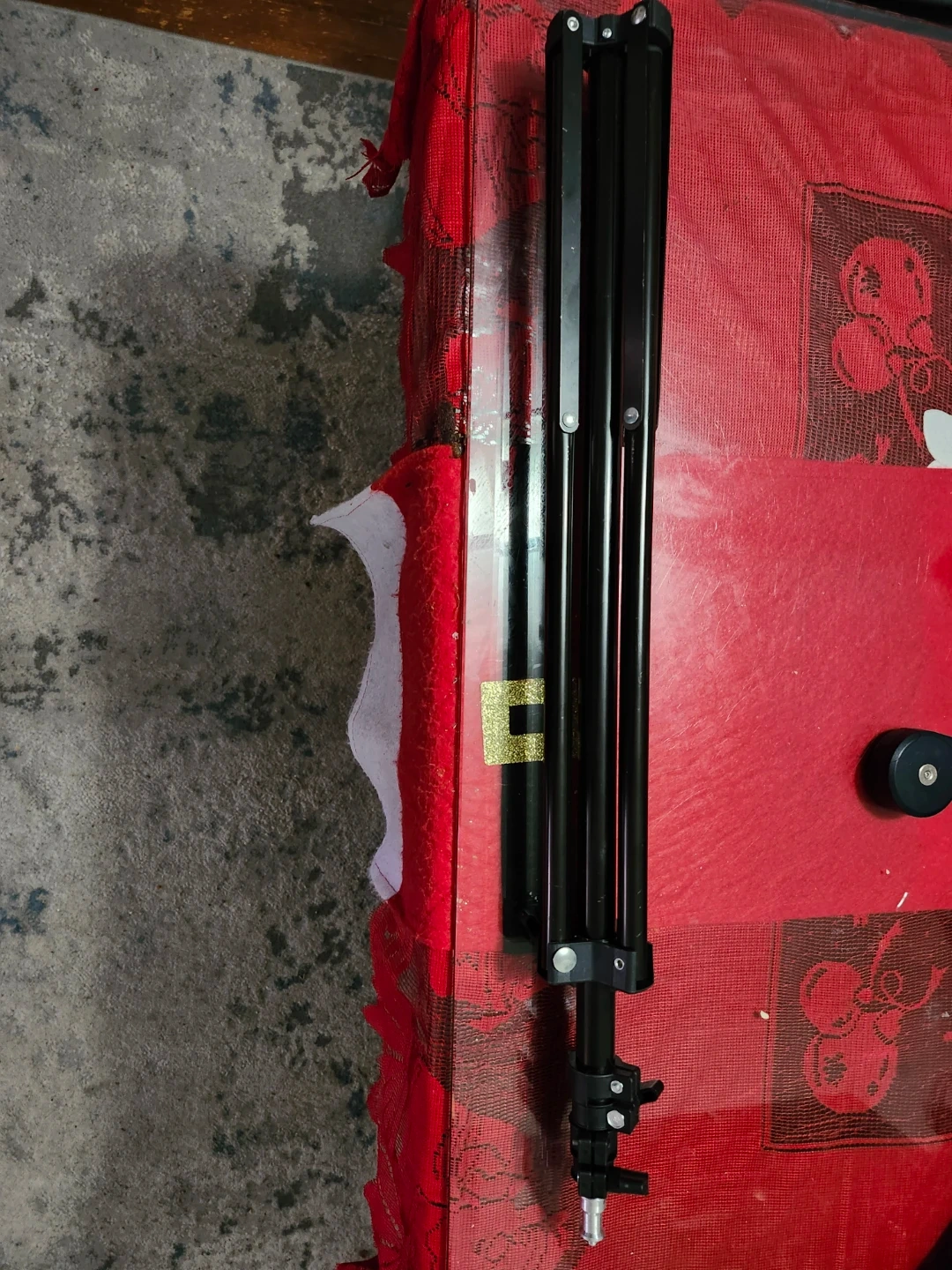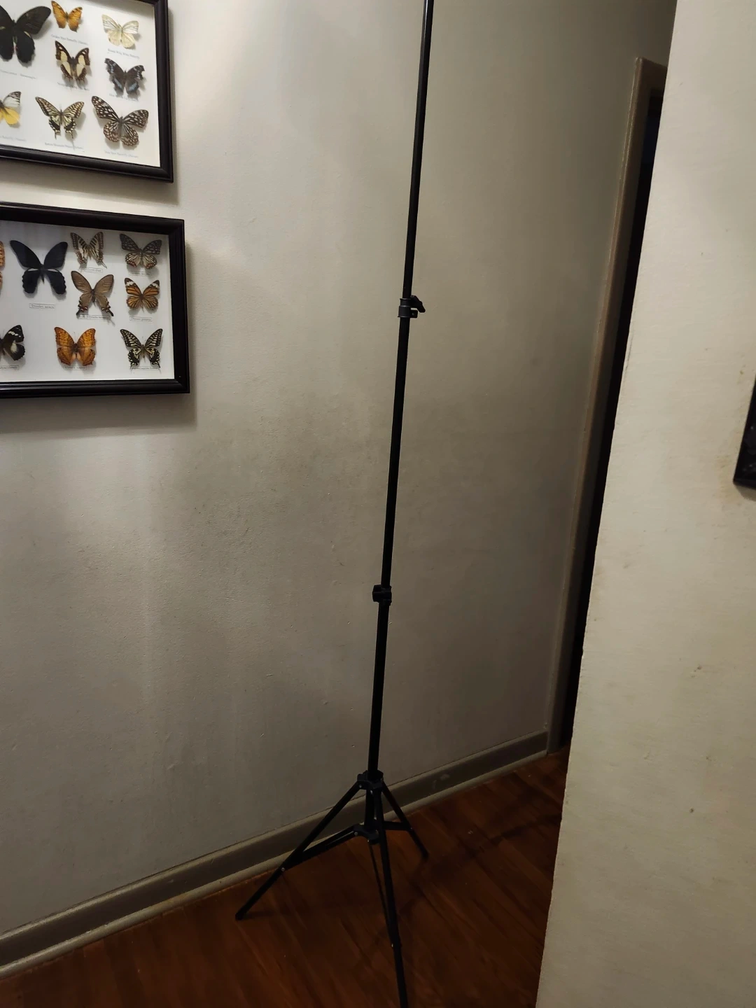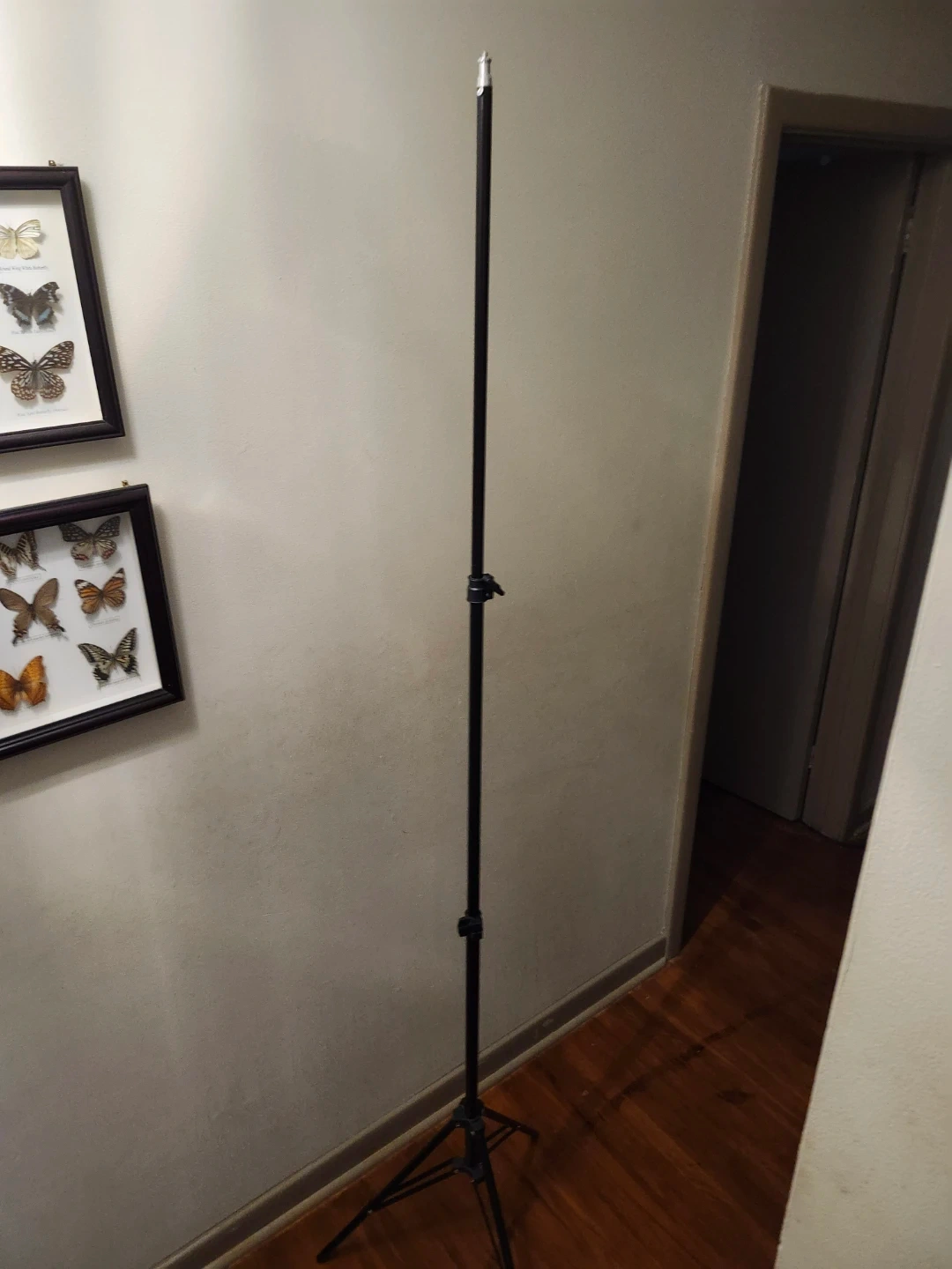 This is an adjustable stand with tripod base. It's made of black metal and features adjustable height settings. This stand is great for supporting studio lights or cameras.