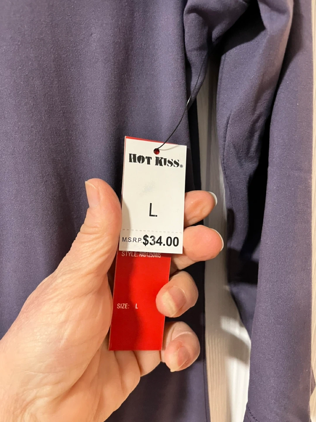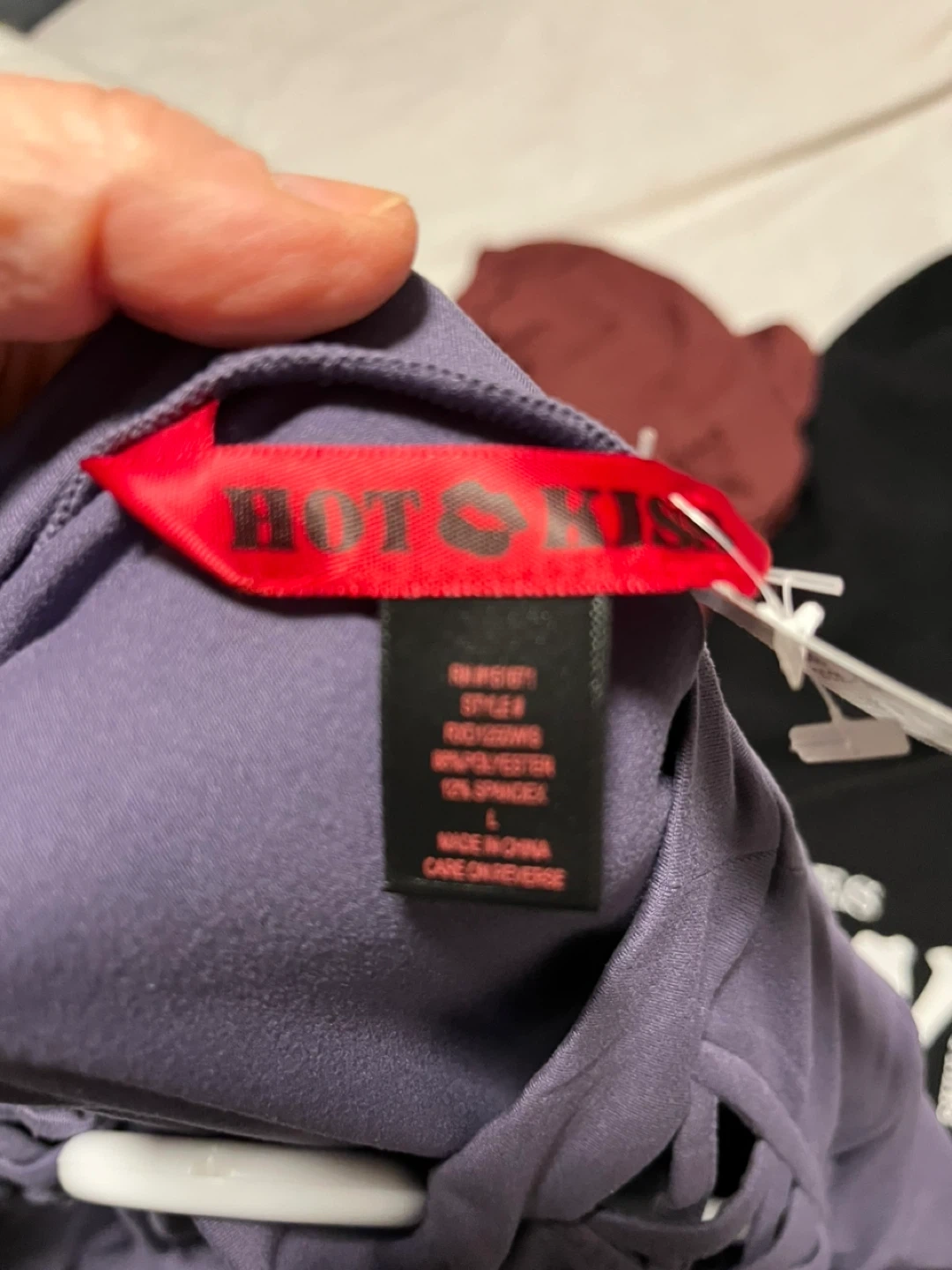 This Hot Kiss dress is a size large and features a unique lattice detail at the neckline. It's made with a blend of 92% polyester and 8% spandex for comfort and stretch. The dress comes in a lovely grey colour.
