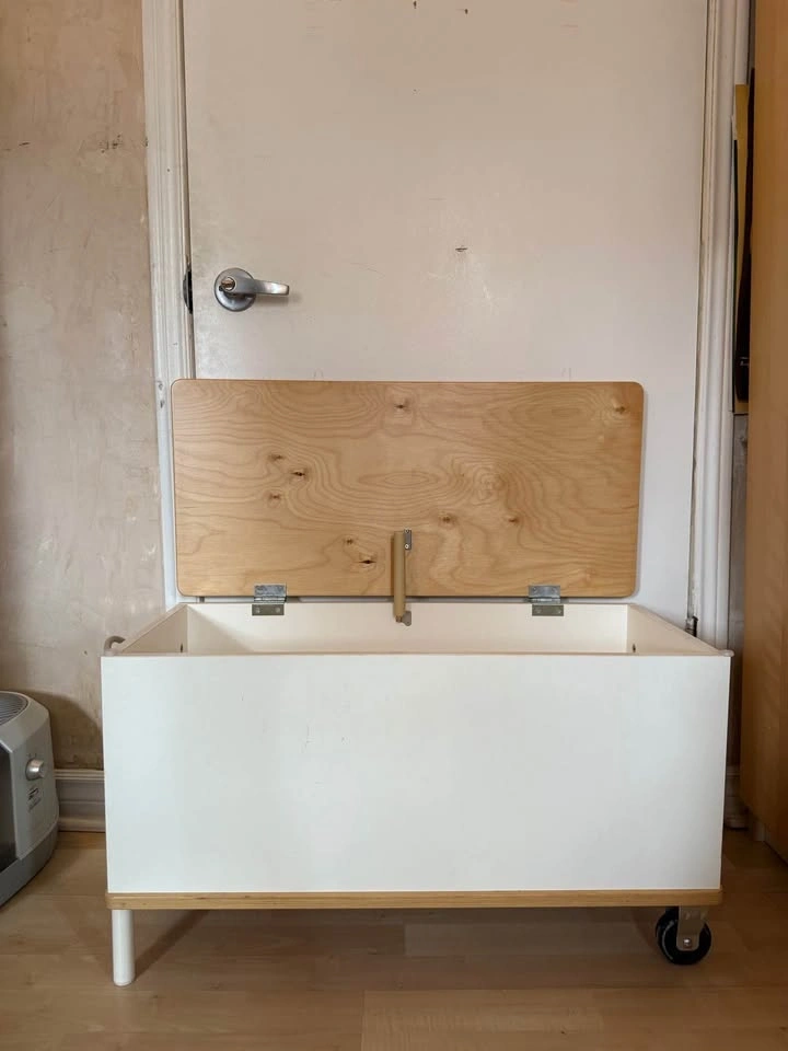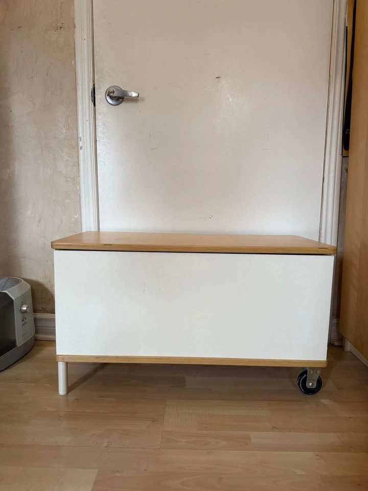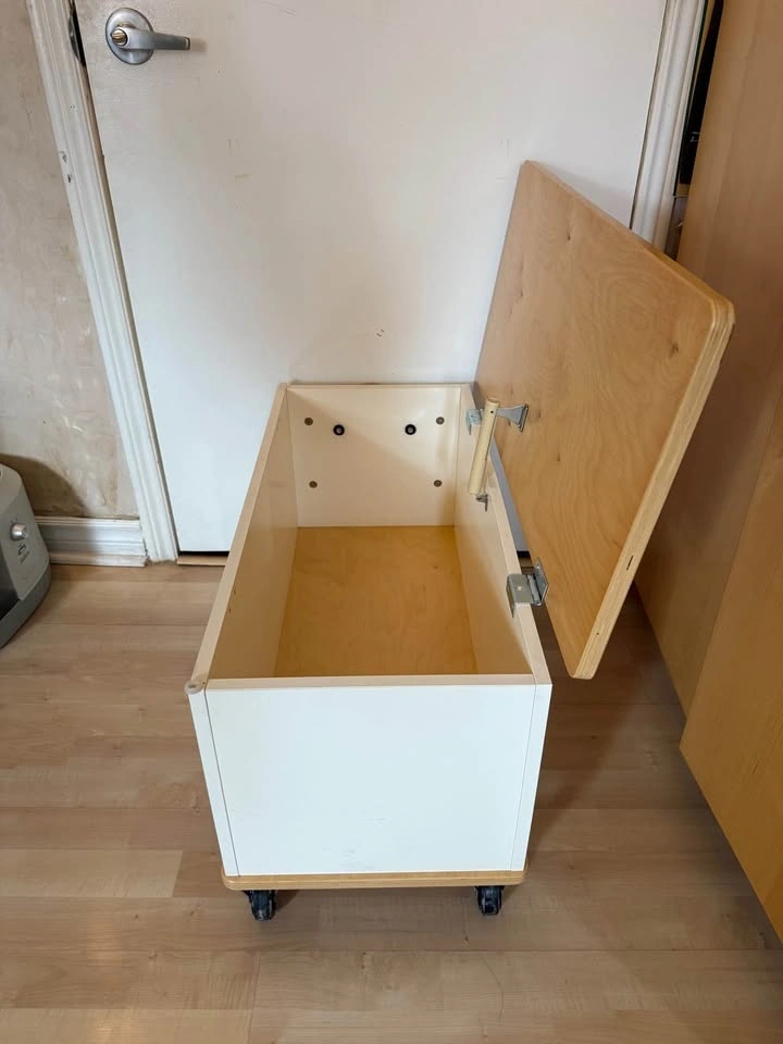 Versatile storage chest and seats. Has a plywood top and bottom, with a white body. Lid opens upwards with soft hinges. Rope handle on one side. Has wheels on one end and two legs on the other end, making it easy to move around. Good for toys, blankets, and others.