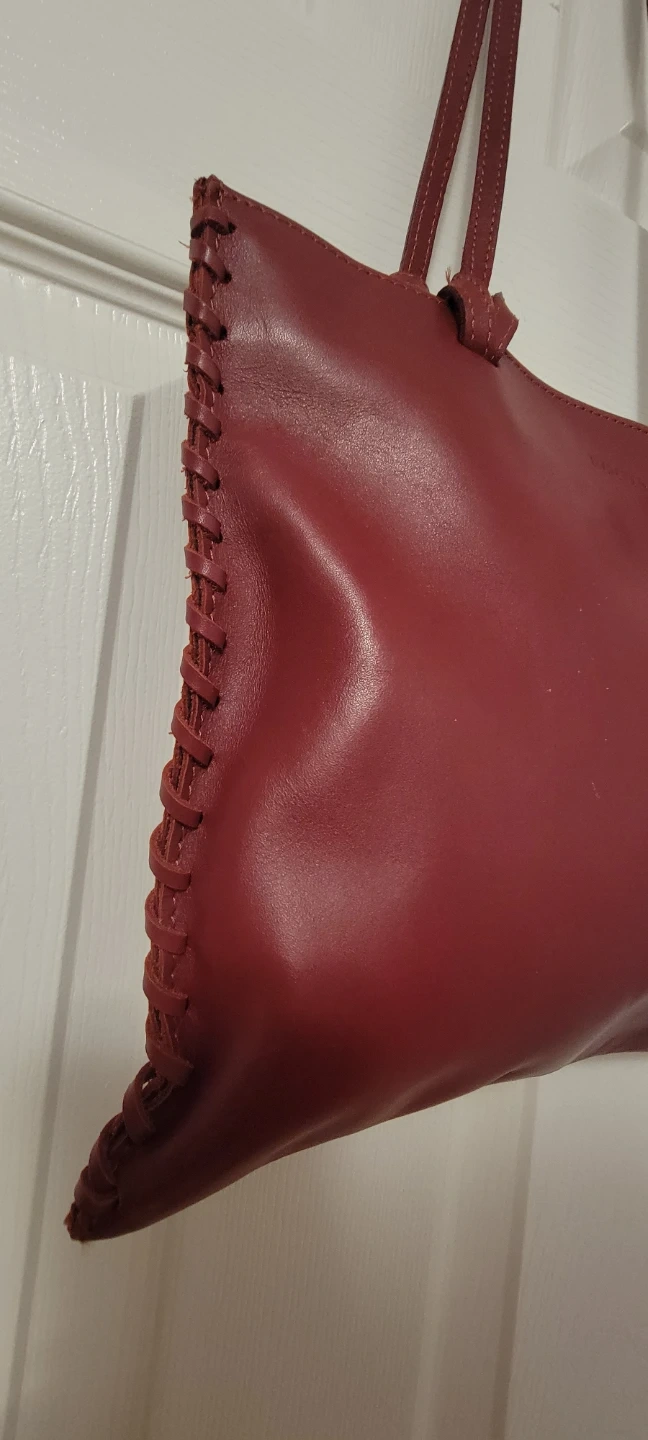 This Roots shoulder bag is made of red leather. It features braided side details and a zippered closure. The interior has a Roots label.