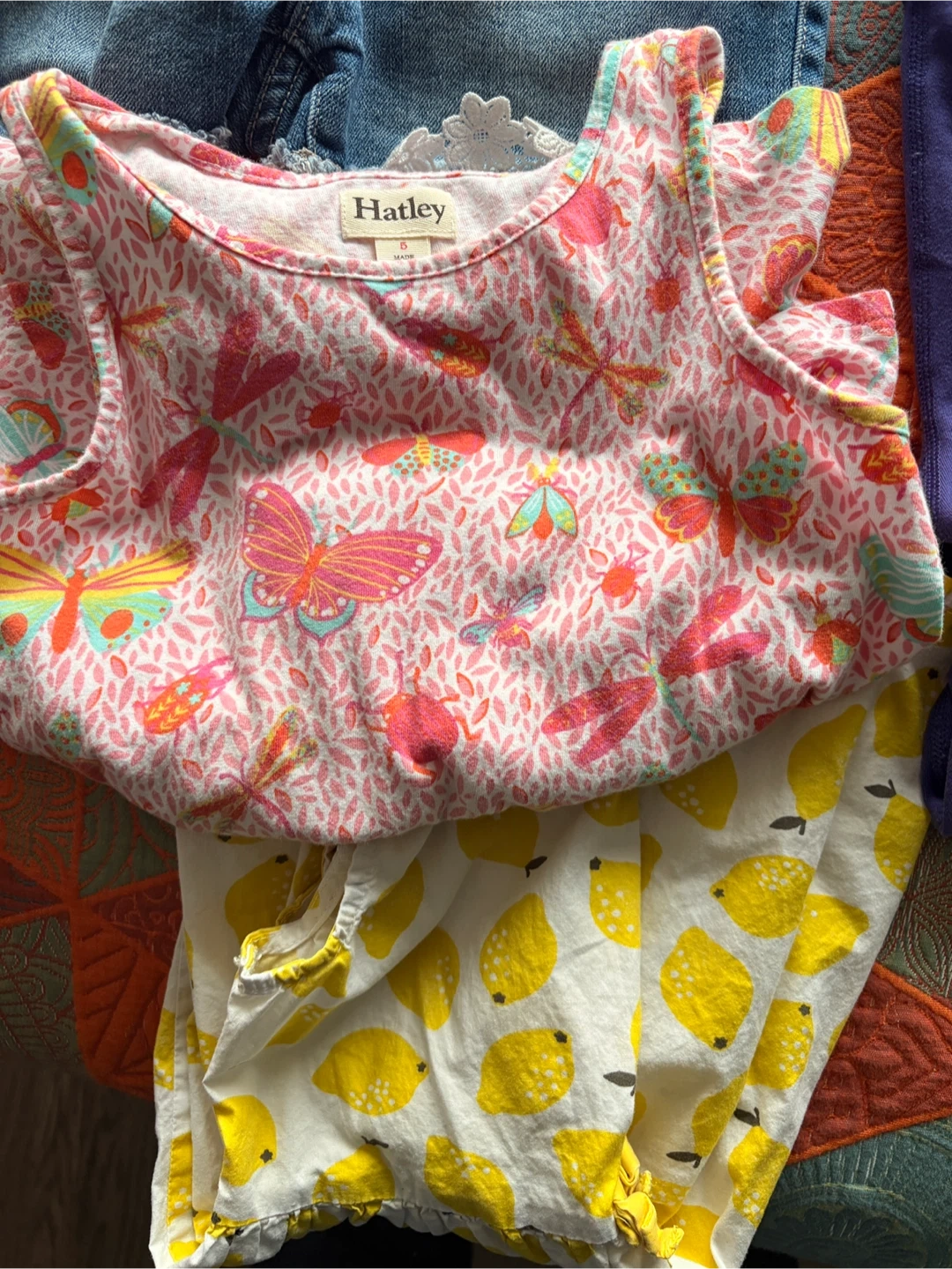 20 pieces included. Cute girls' denim overalls with lace trim. Includes a pink butterfly print top by Hatley and other assorted tops and bottoms. Perfect for everyday wear and playtime! 20 OBO