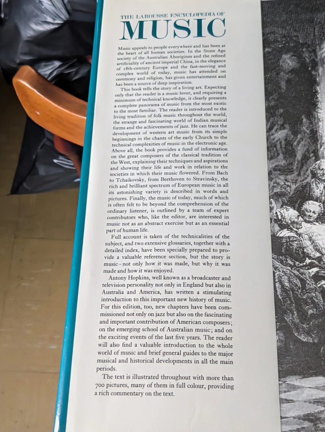 Selling The Larousse Encyclopedia of Music, edited by Geoffrey Hindley with an introduction by Antony Hopkins. It's in good condition!