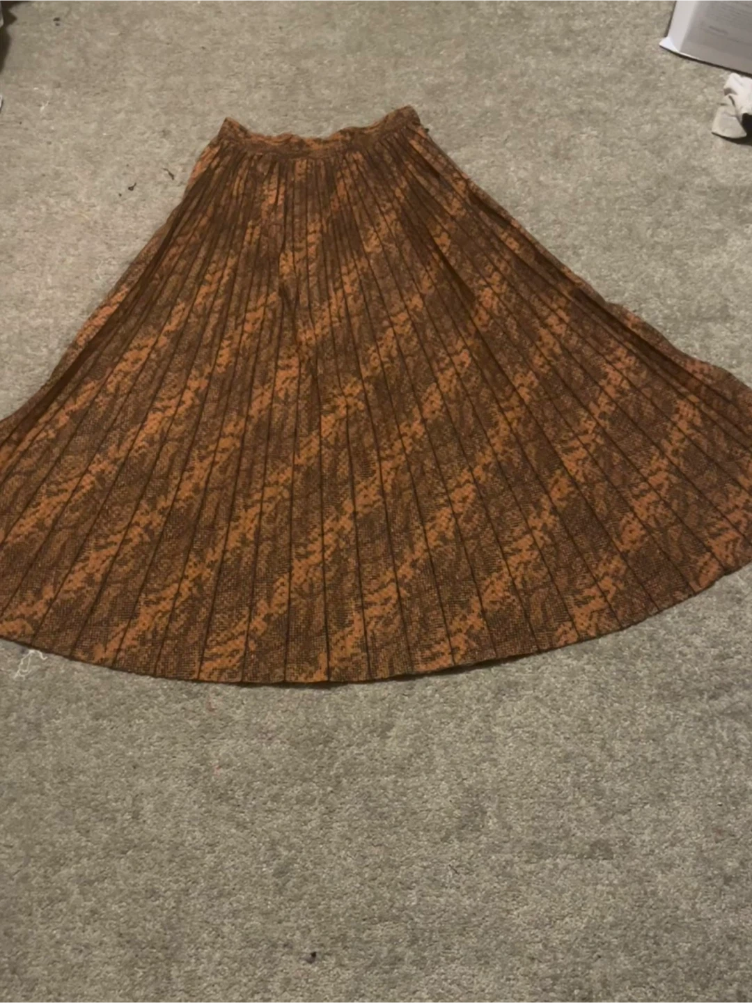 A brown pleated skirt, perfect for adding a touch of elegance to your wardrobe! The skirt has a unique pattern throughout. Great for any occasion