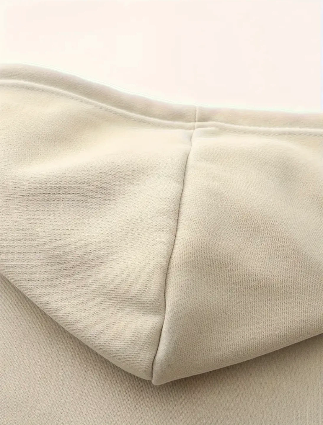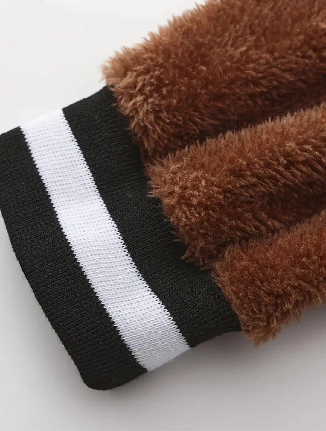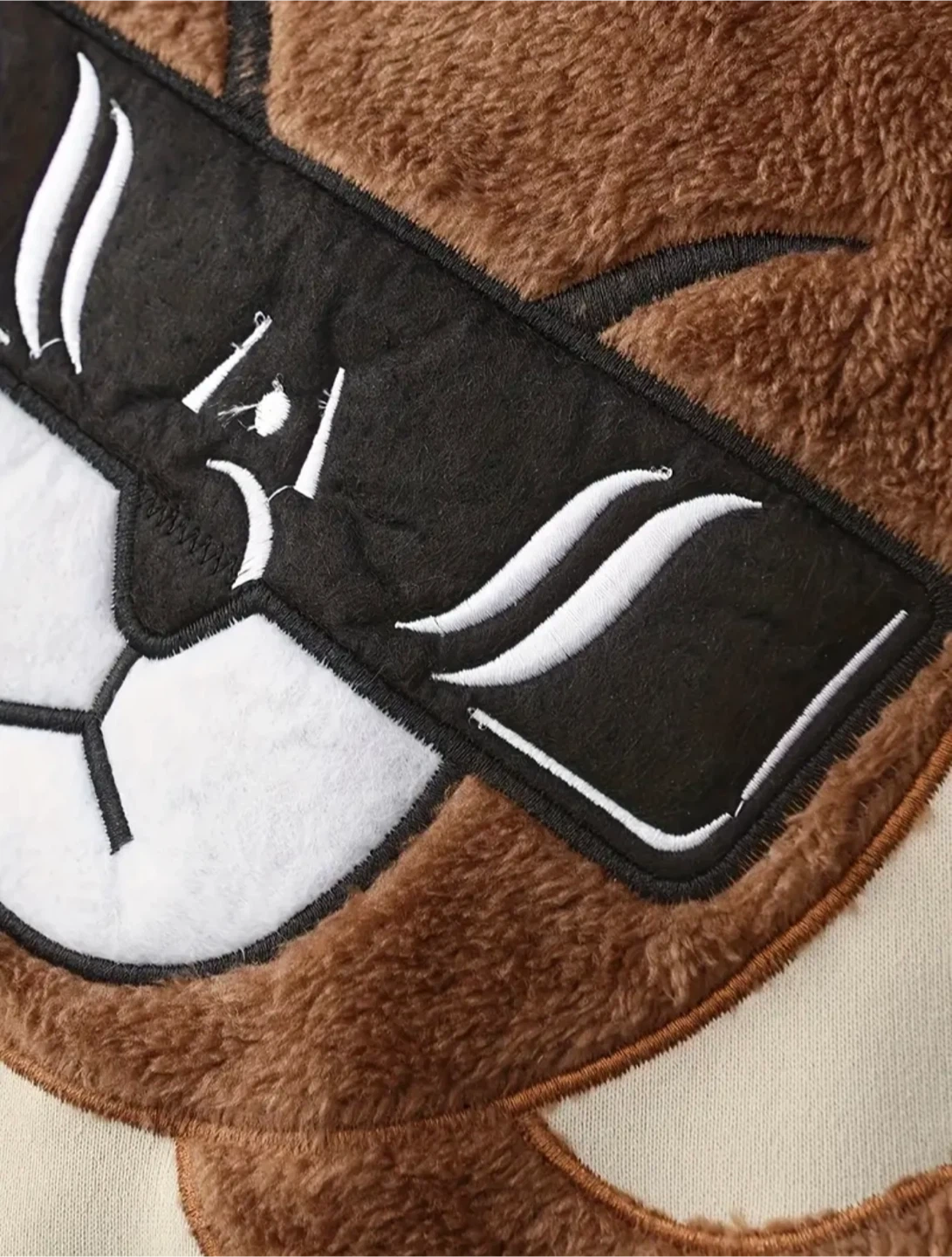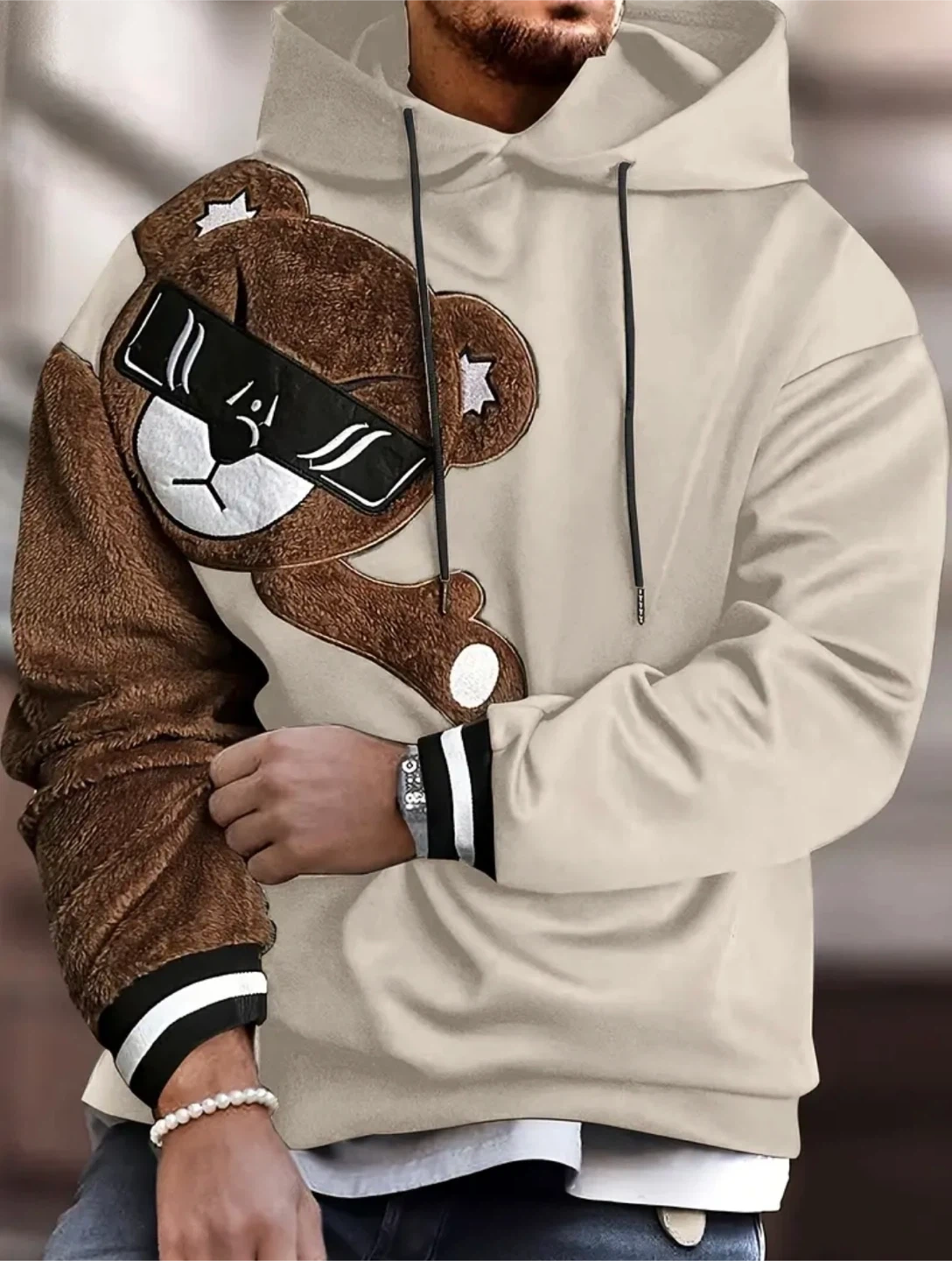 New, unworn, hoodie features a fuzzy teddy bear graphic on the chest with sunglasses detailing. Size M. It has a contrasting fuzzy brown sleeve and ribbed cuffs and hem.