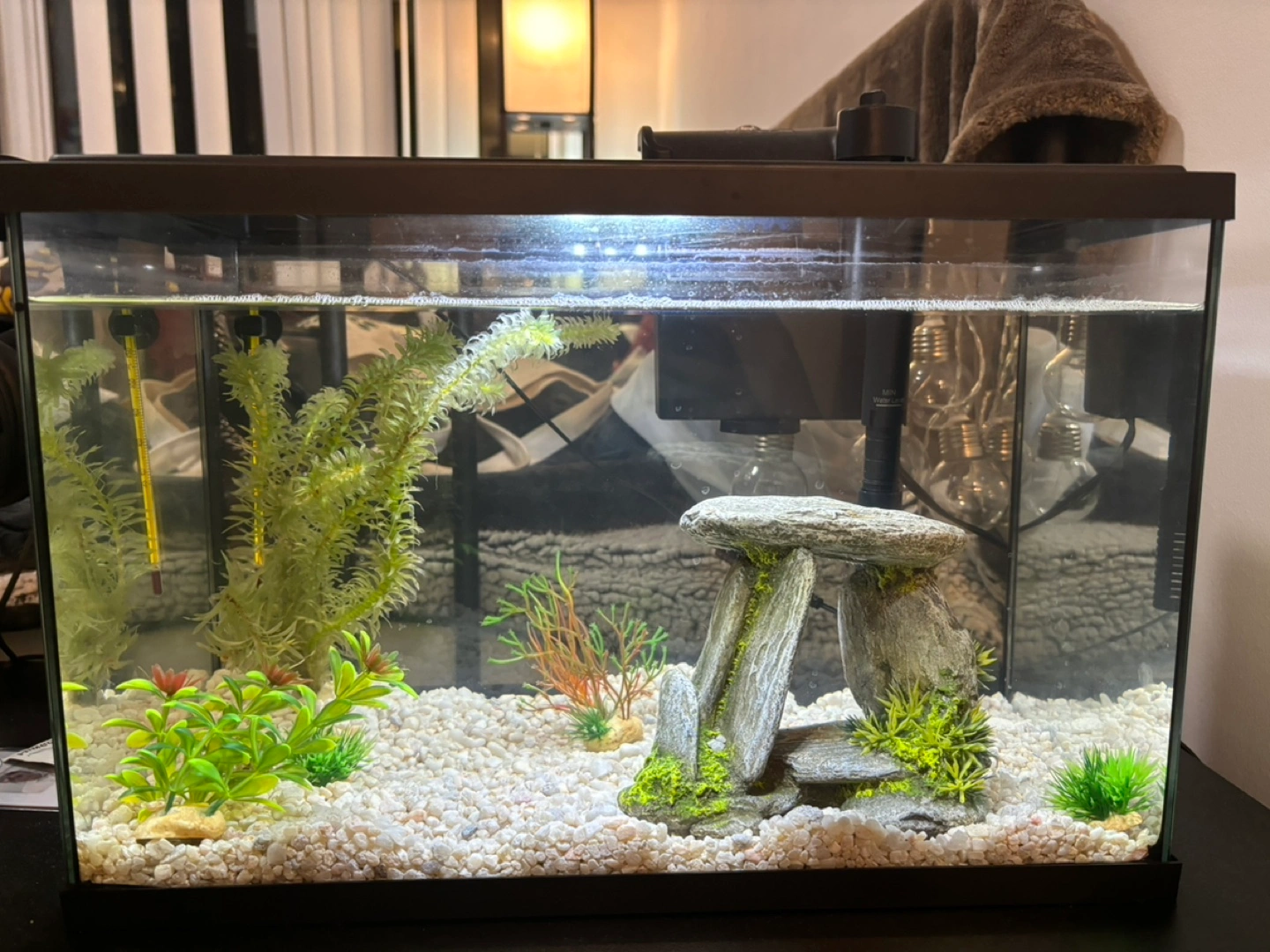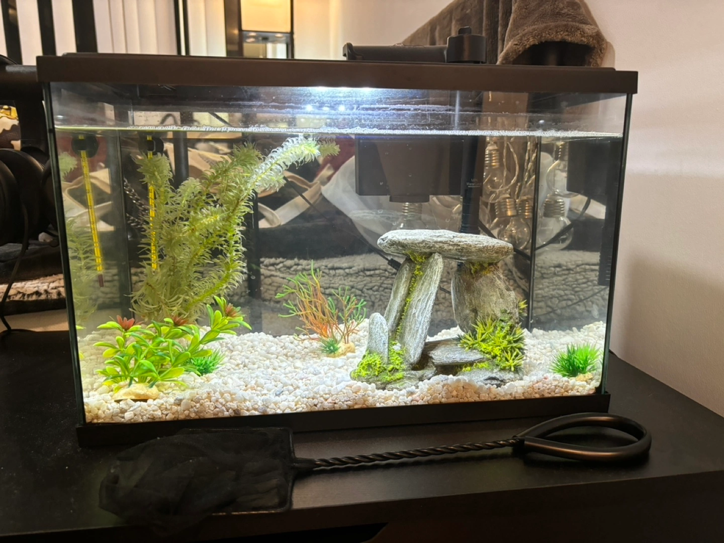 40Includes: 5.5 Gallon Glass tank with hood Bright White LED Thermometer 4 in Nylon Net Top Fin Silentstream 10 Power Filter with cartridge Water conditioner and biological enhancer (both more then half left) Decor Gravel - glow in the dark Food for beta fish(full) Great for beginners! Aquarium was in use 1,5 month and in great condition.