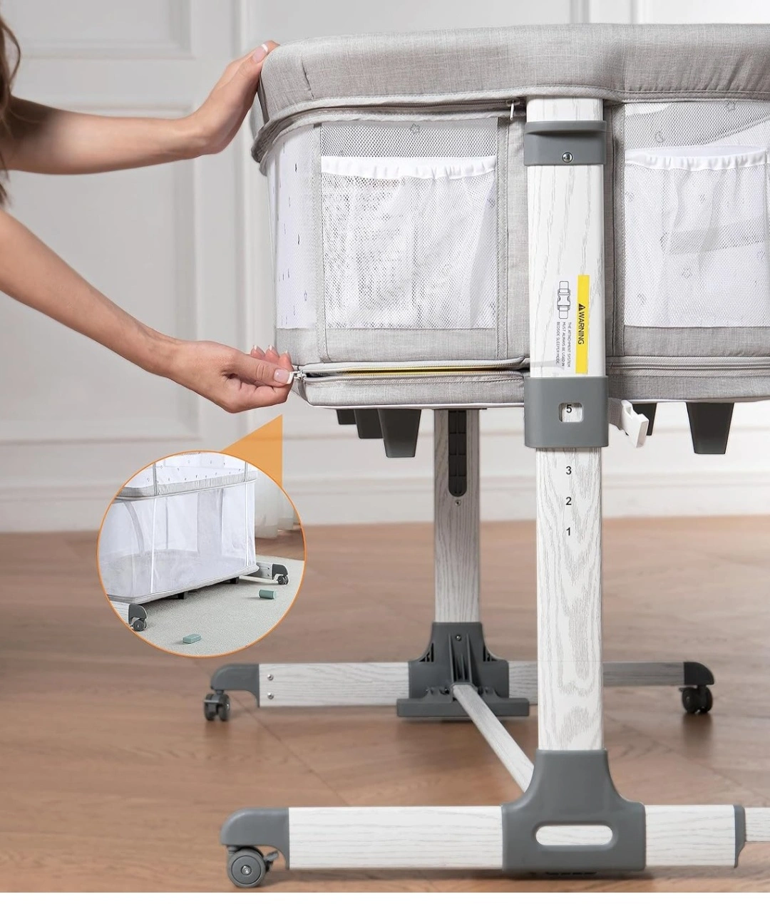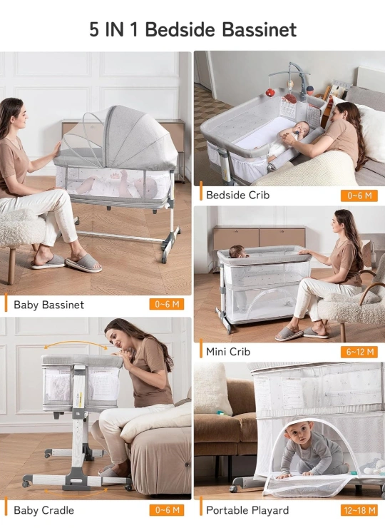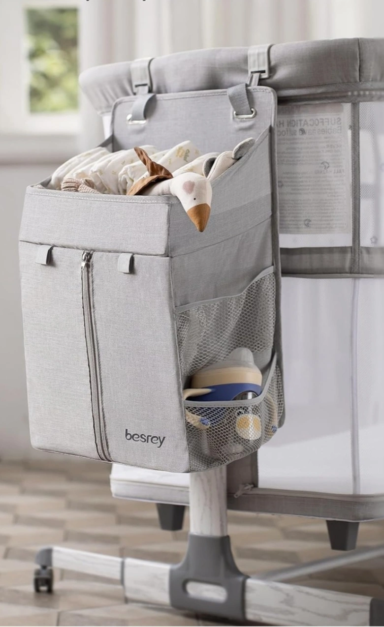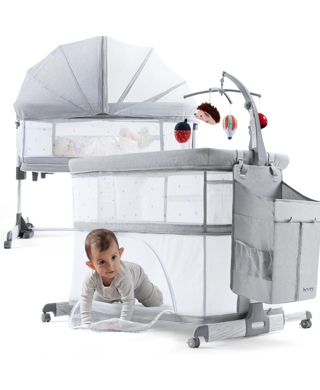 Grey bassinet with a canopy, mobile, and storage bag. Can be converted into a mini crib, portable playard, and baby cradle.