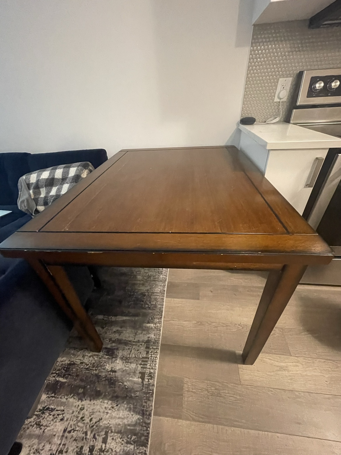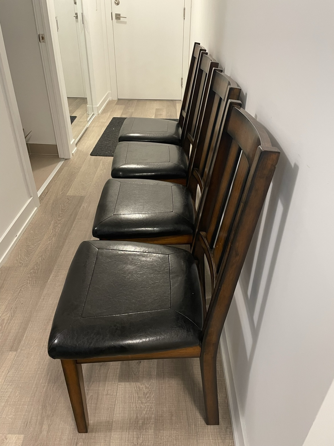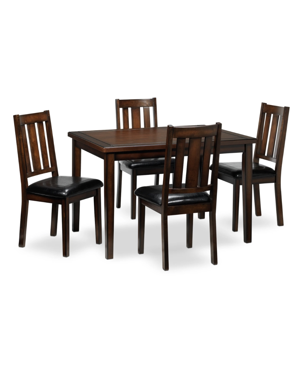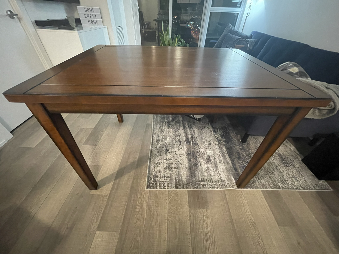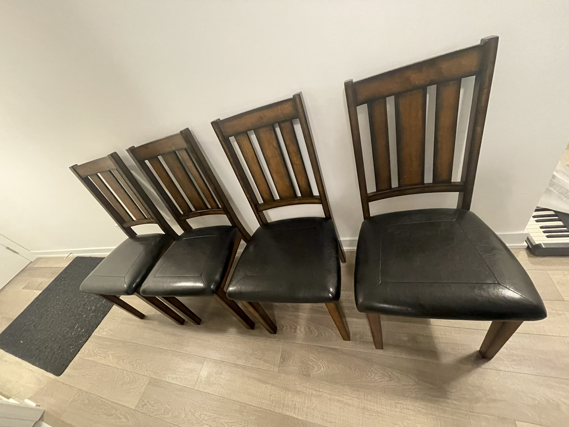 15IF LISTING IS UP, means it is available. No holds unless deposit. Midtown Toronto Table already dismantled, chairs can be too Dimensions: Table: Width 35.5” x 30” height x length 47.5” Chair: width 18.5” x height 38” x depth 21” Colour: Dark Brown Cherry Straightforward Style: The straight lines and clean angles of the Boyd dinette set offer your dining room a modern yet casual sensibility that will make mealtime about the simple moments in life. Etched lines along the border of the table echo its rectangular shape and a beveled edge adds quiet detail. Slatted chair backs combine with black leather-look upholstery on the seats for a sleek look. Unique Features: Compact size makes it a wise choice for smaller dining spaces. Designed for your cozy dining nook, this casually styled dining collection will be a perfect fit. Rubberwood and Koto veneers provide strength while being easy to maintain. Done in a black finish, the leather-look fabric is soft to the touch and easy to wipe clean. Chairs are designed with classic slatted backs and black bicast leather for comfort and style.
