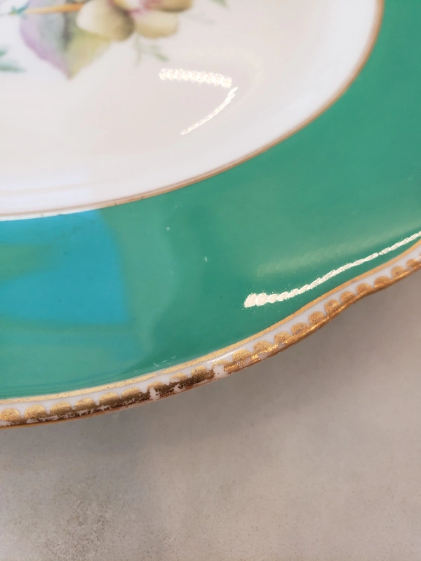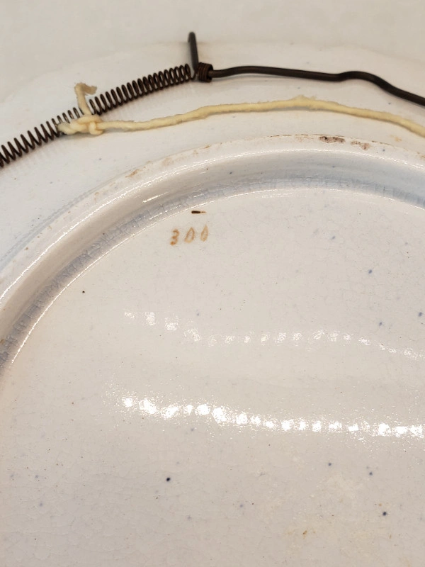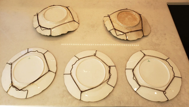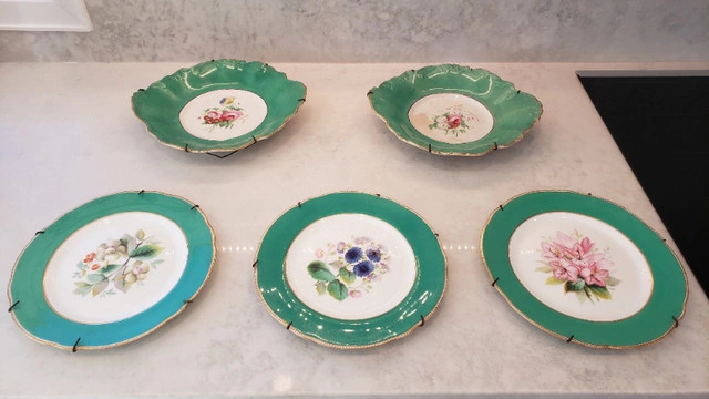 The top 2 plates are two inches long at the handles part and have the number 300 on the back. The bottom 3 plates are 9 inches in diameter and have the number 4 4880 on the back. All the plates have metal bracing at the back. The top 2 plates are crazing/ cracking. All plates have scratches to the flowers, wear to the gold etc.