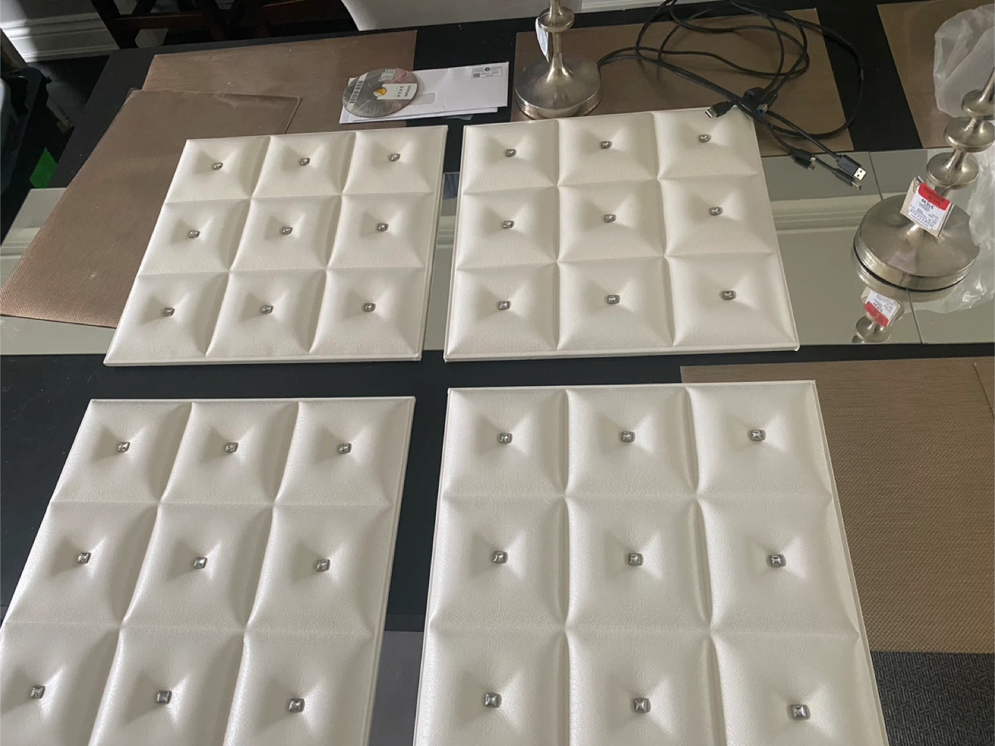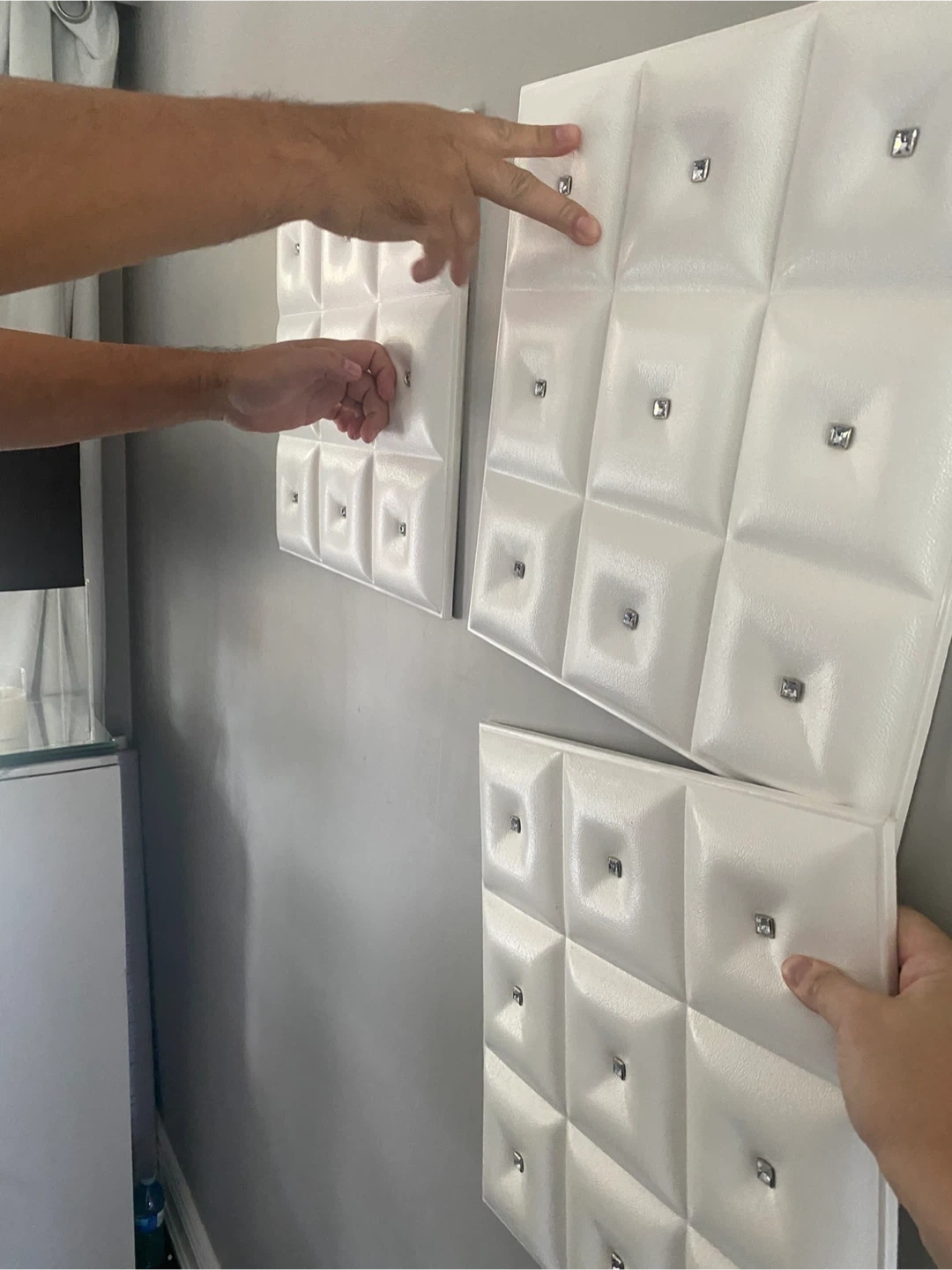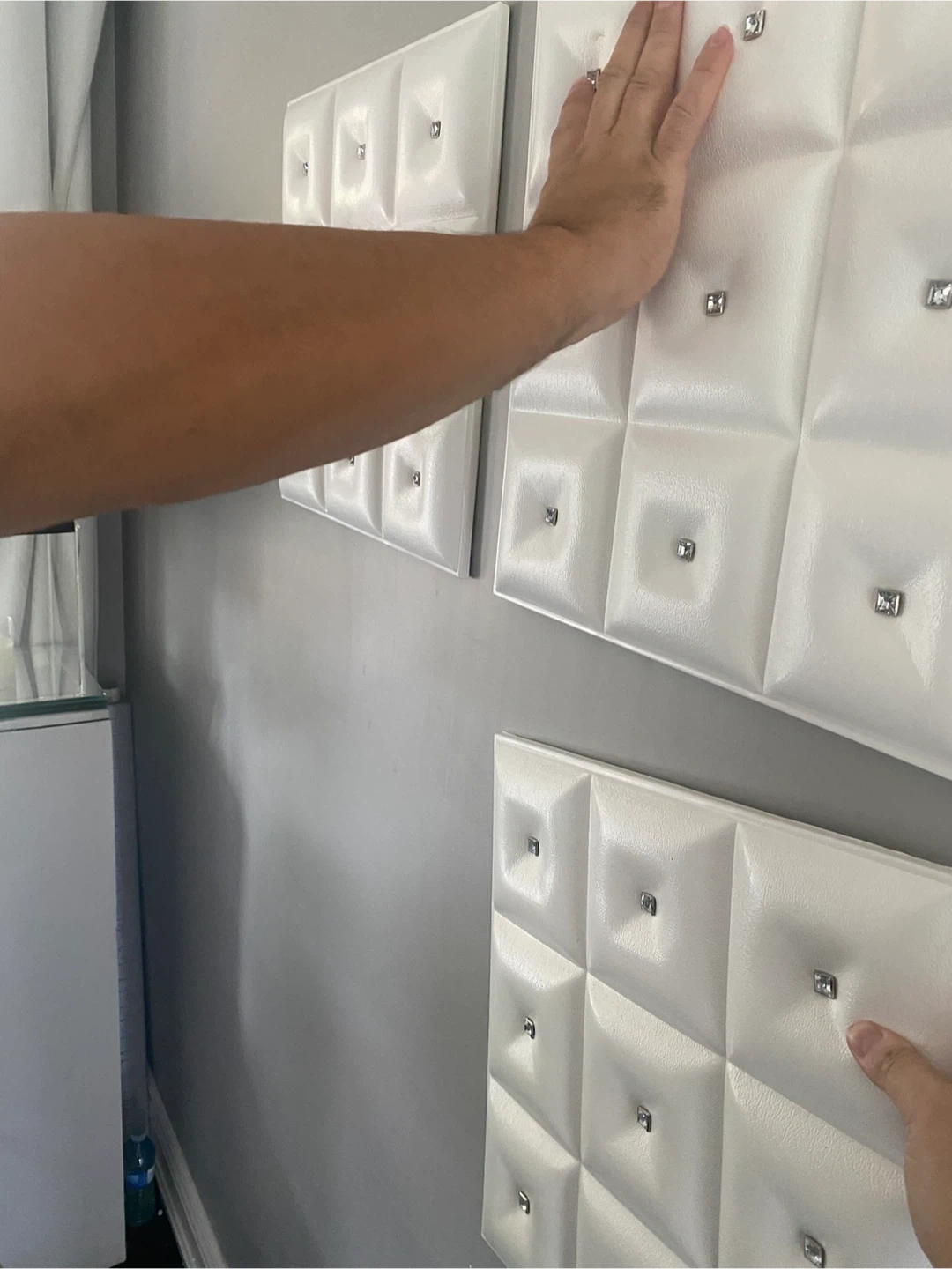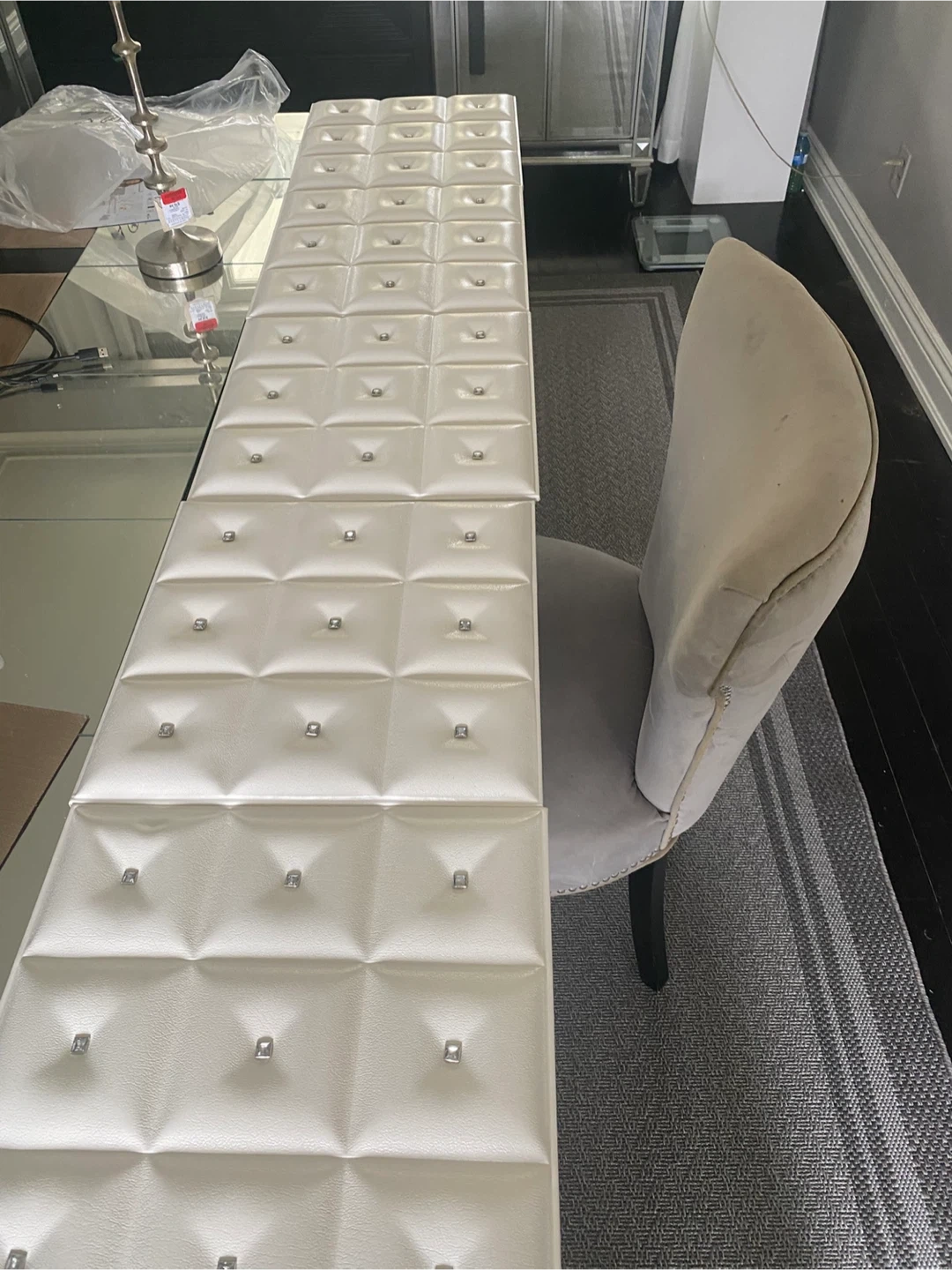 59Selling a set of four white faux leather wall panels! These panels feature a stylish, tufted design with crystal accents. They're perfect for adding a touch of elegance to any room. Easy to install and in great condition!