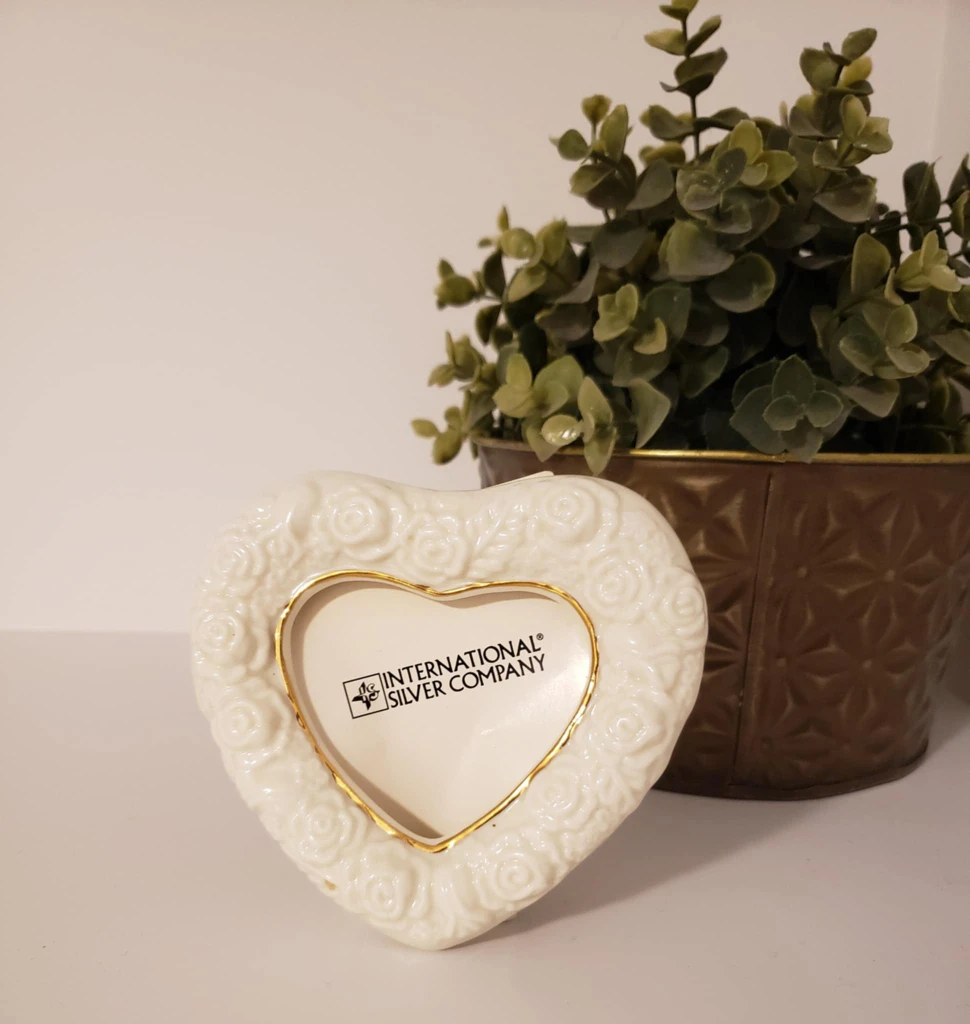 White porcelain heart-shaped picture frame. Gold trim. Rose detailing. Small size. Perfect for a cherished photo.