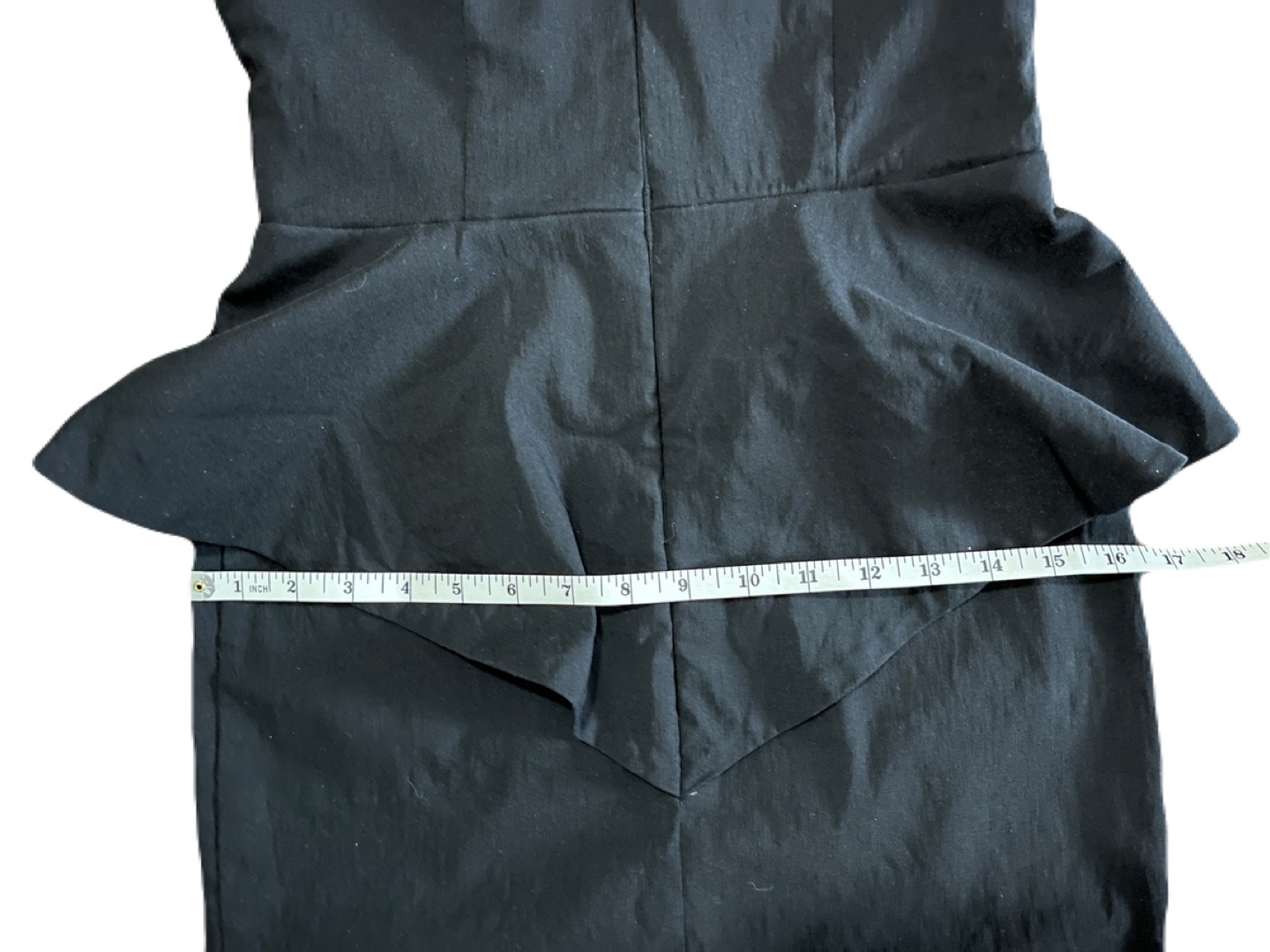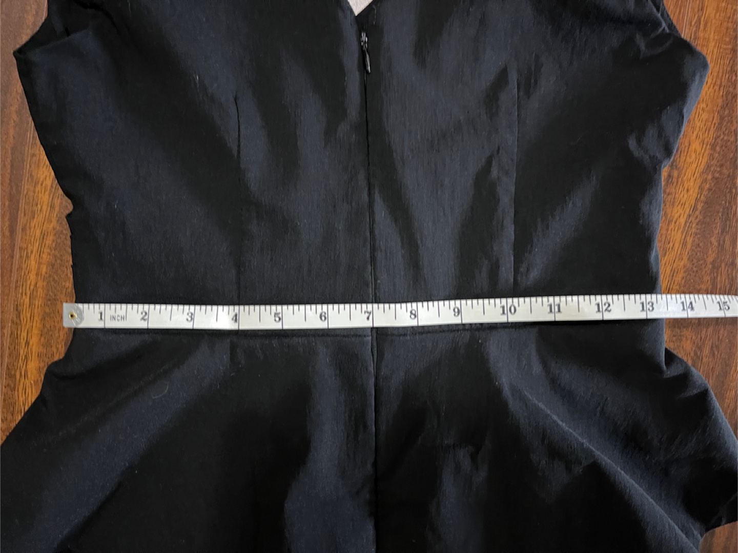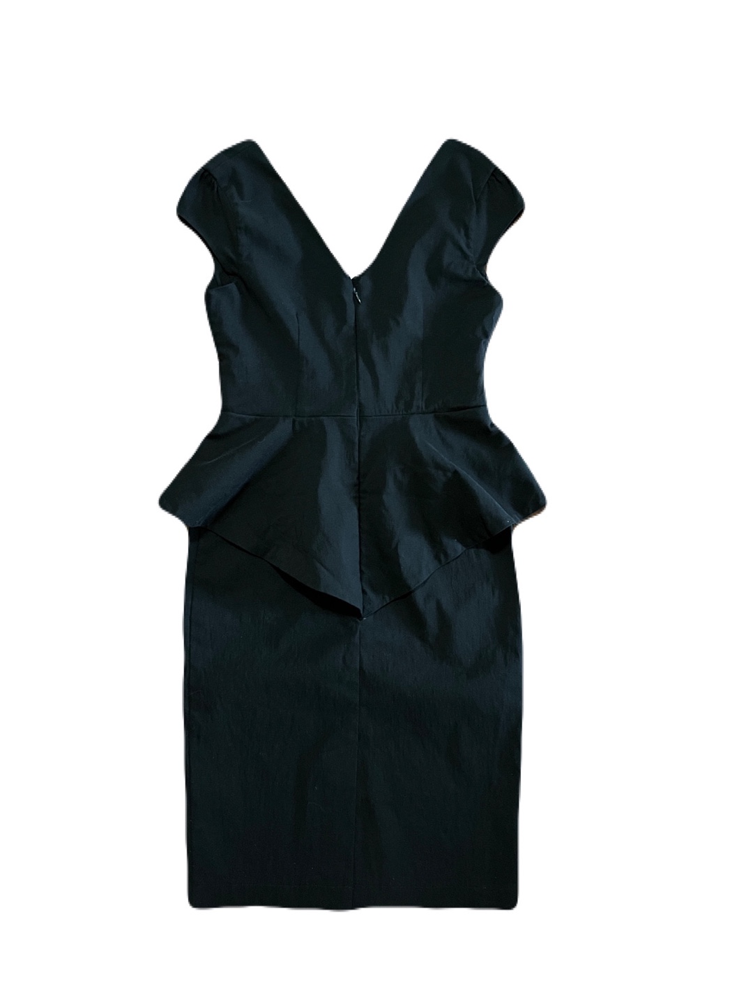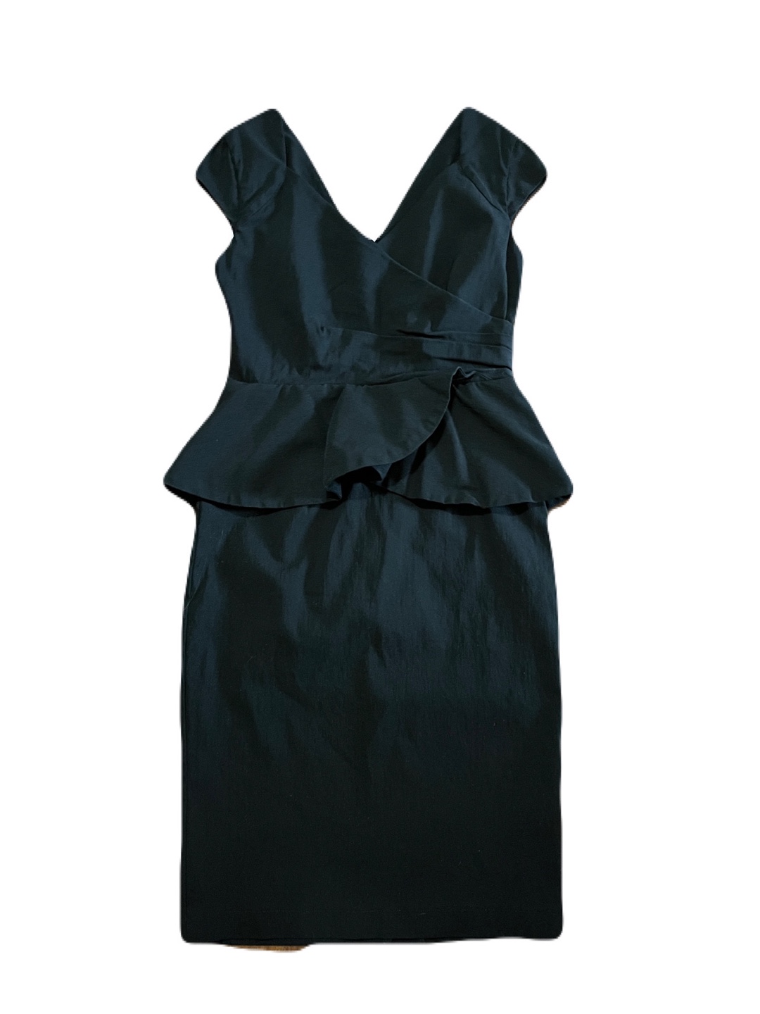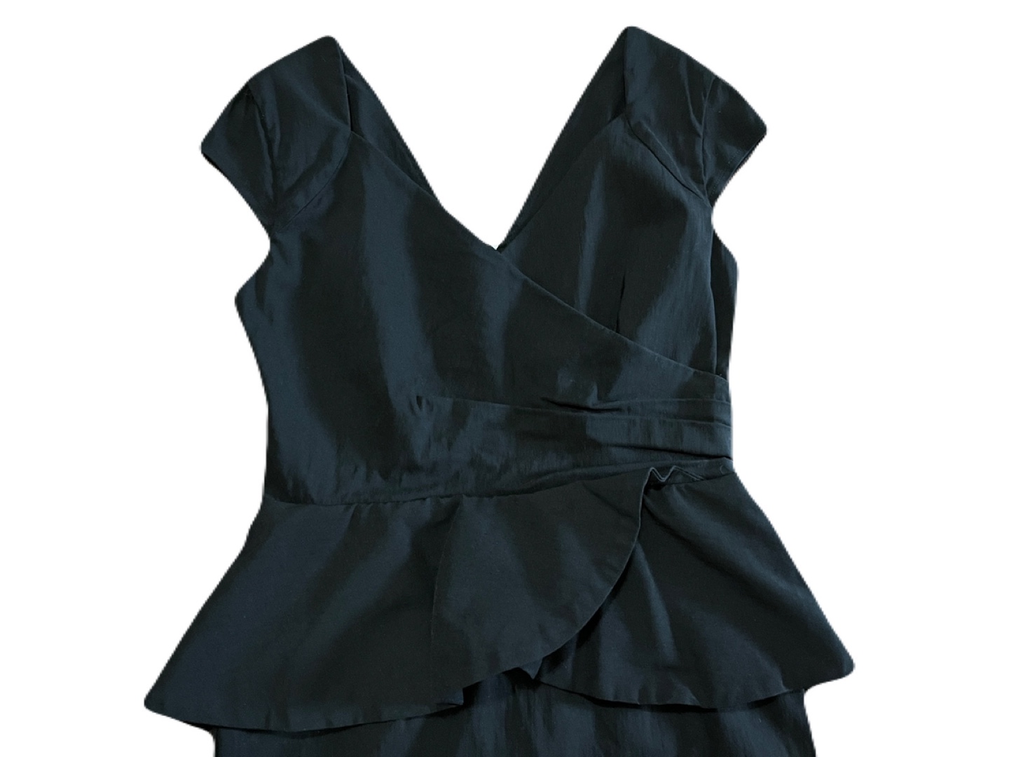 Gorgeous black peplum dress in excellent condition. Crossover bodice and cap sleeves. Peplum waist. Vented skirt. Invisible back zipper. Skims the body in all the right places with lots of stretch: fabric is 75% viscose, 22% nylon, and 3% elastane.
