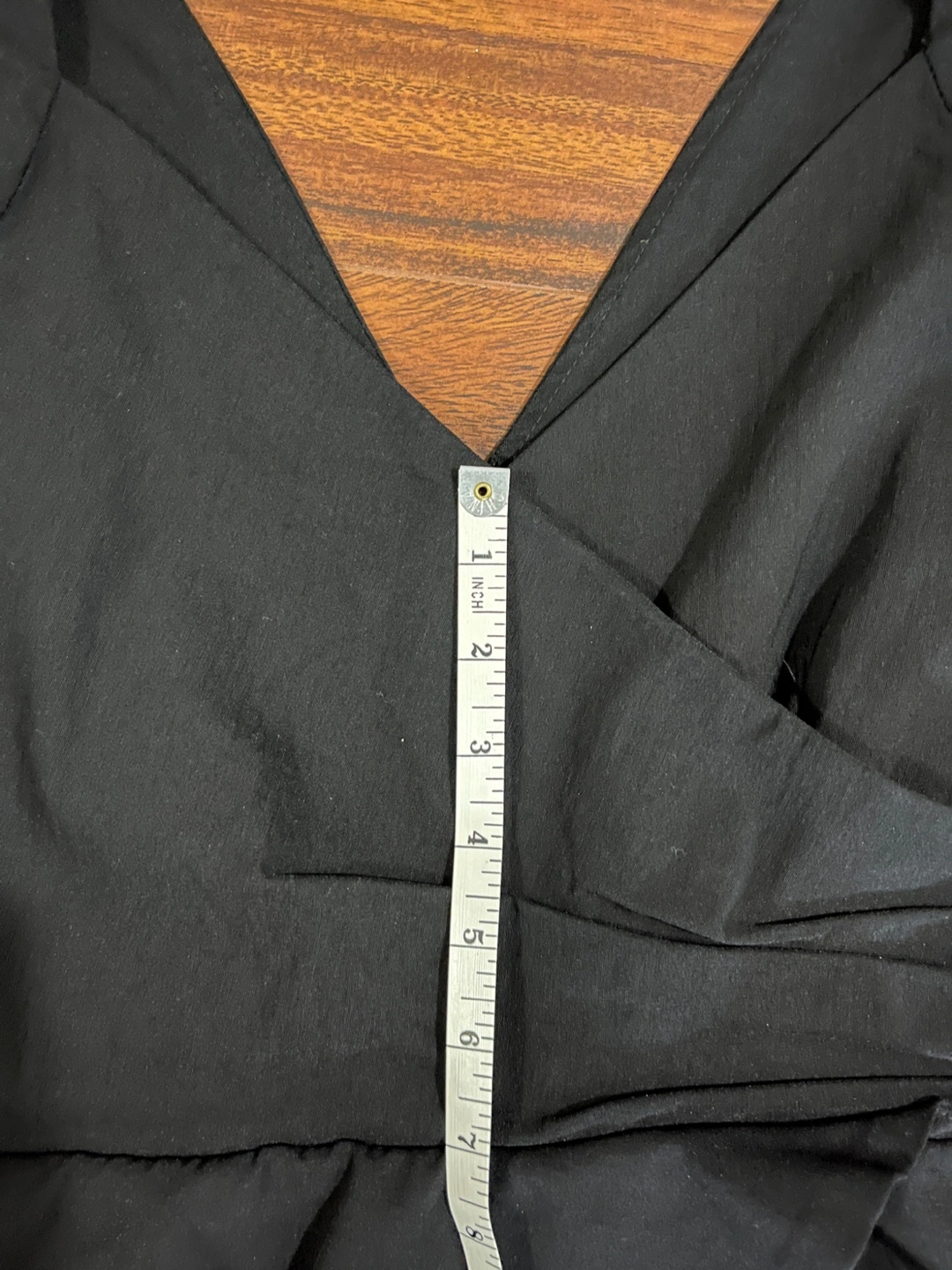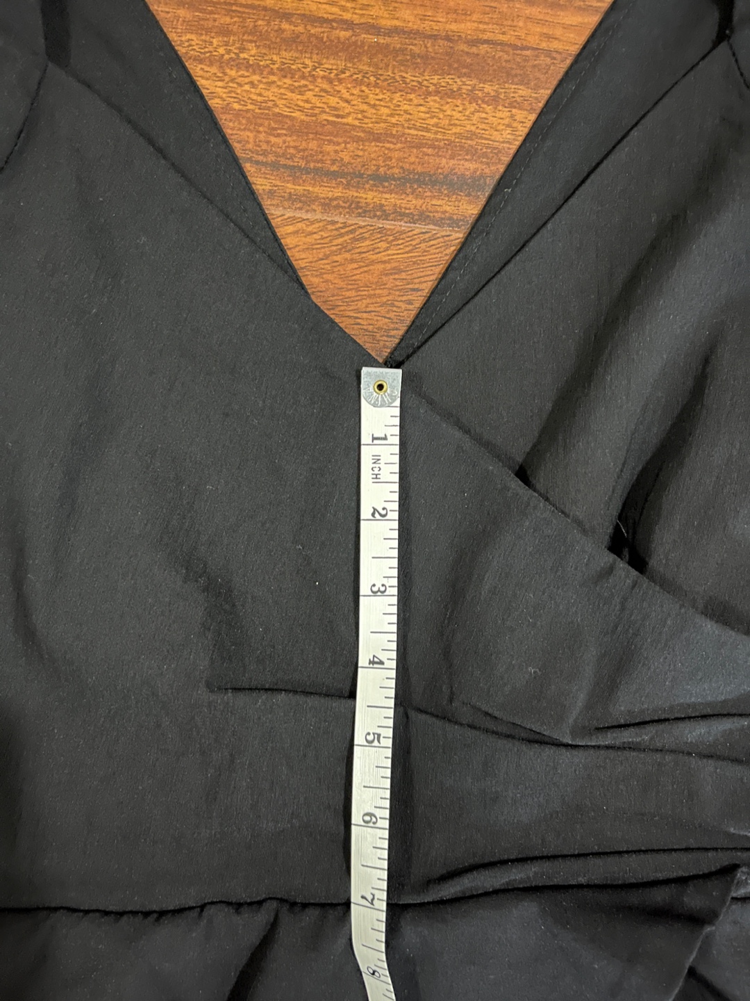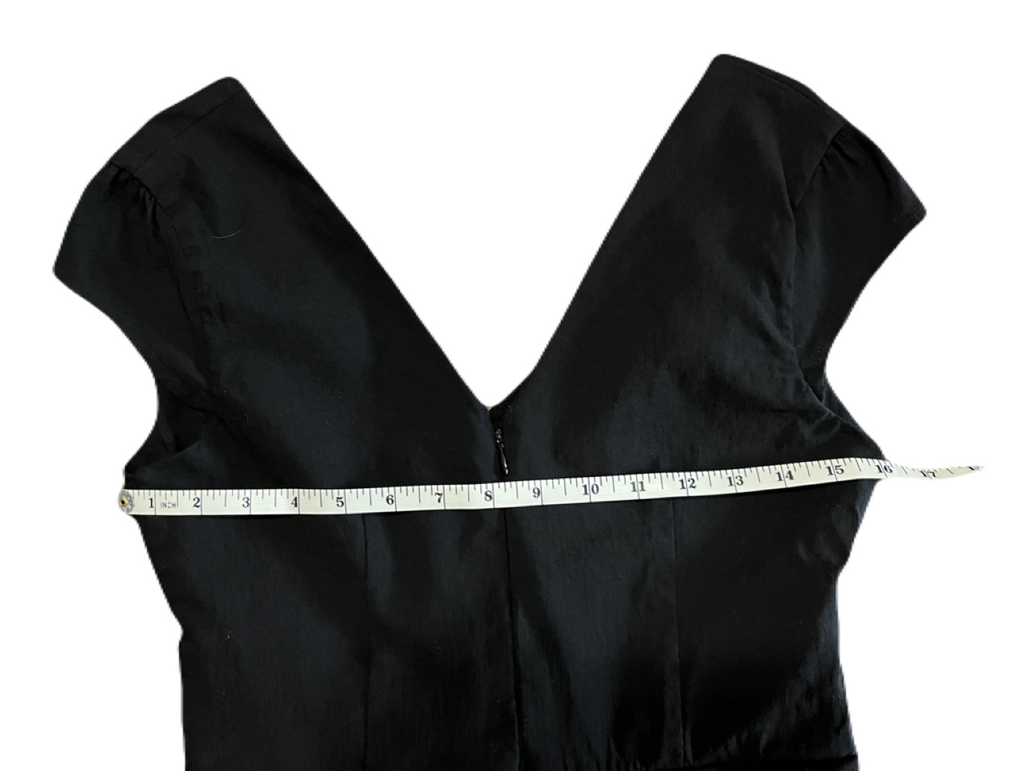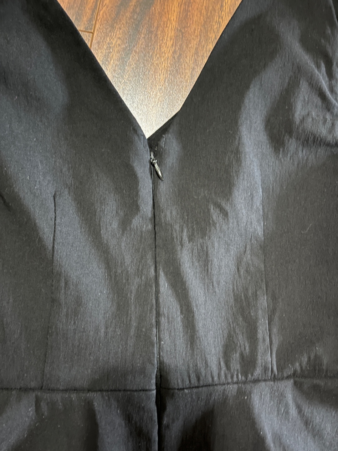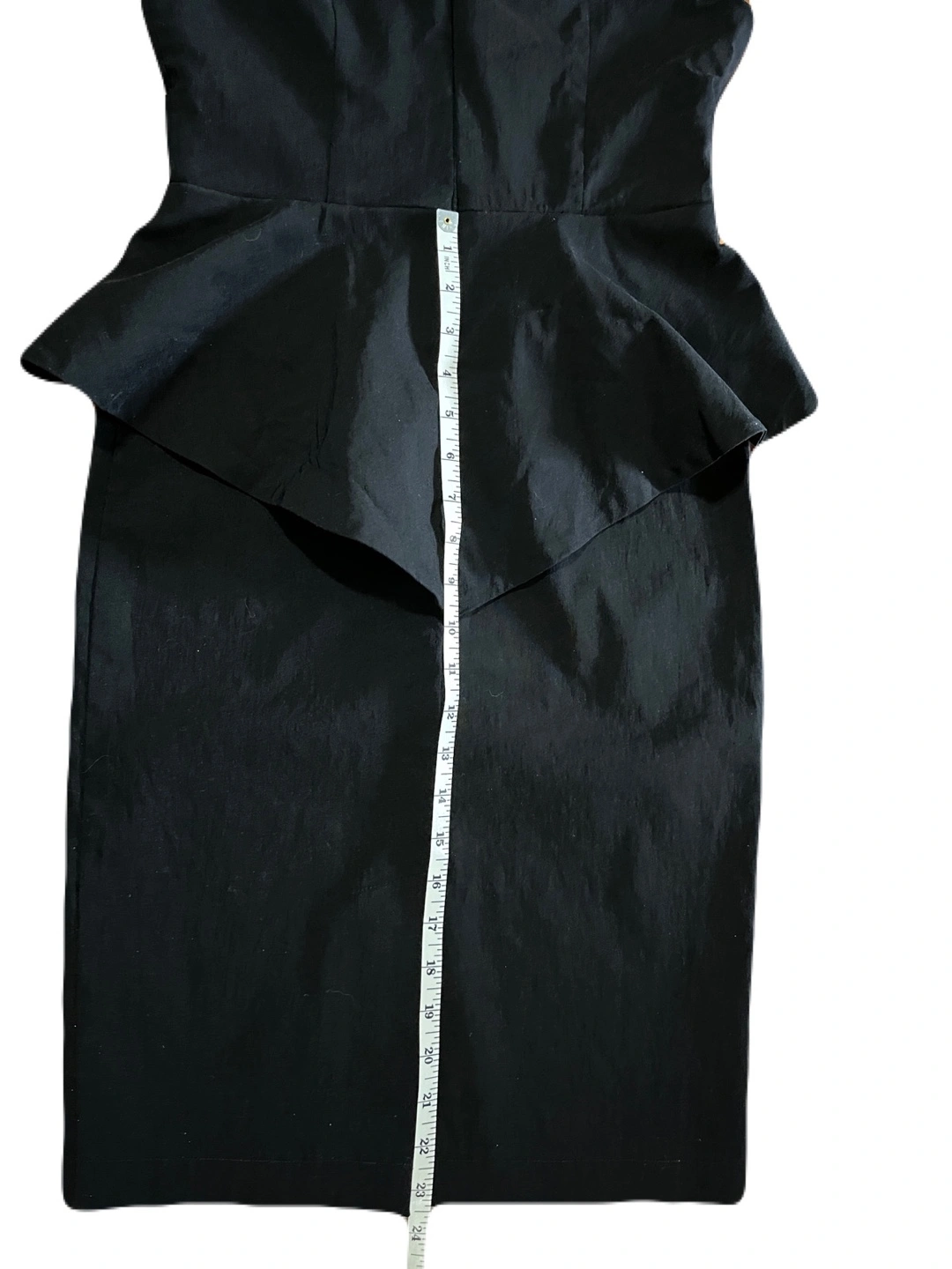 Gorgeous black peplum dress in excellent condition. Crossover bodice and cap sleeves. Peplum waist. Vented skirt. Invisible back zipper. Skims the body in all the right places with lots of stretch: fabric is 75% viscose, 22% nylon, and 3% elastane.