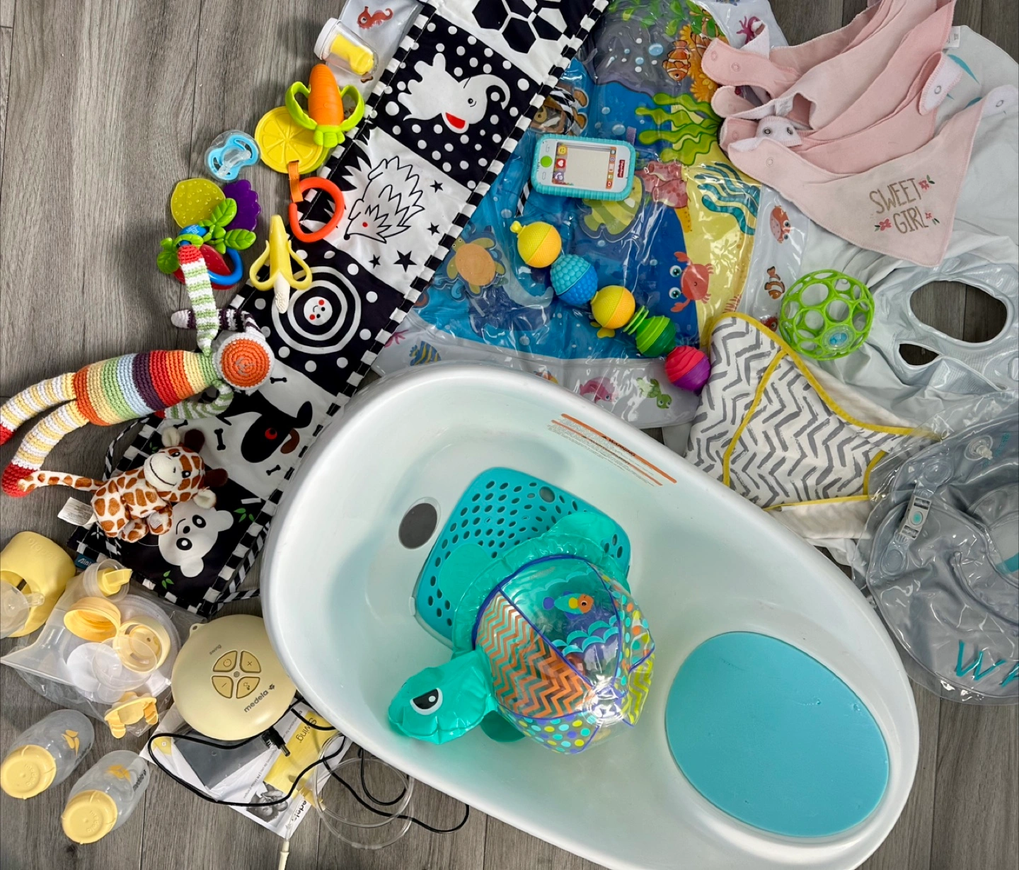 Large baby bundle including infant bath tub, playmat, bibs, toys, and a Medela breast pump. Great for newborns and infants. Everything shown in pictures included.