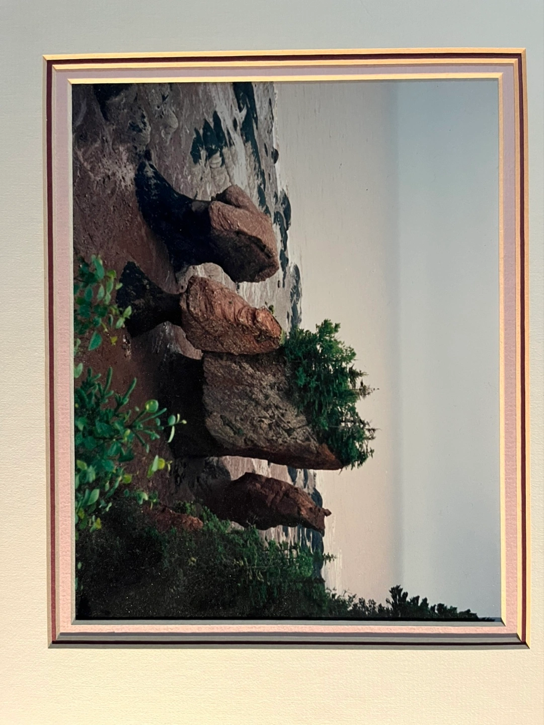 132Matted and framed photograph. Depicts Hopewell Rocks at low tide. Coastal scenery, rock formations, and ocean visible.