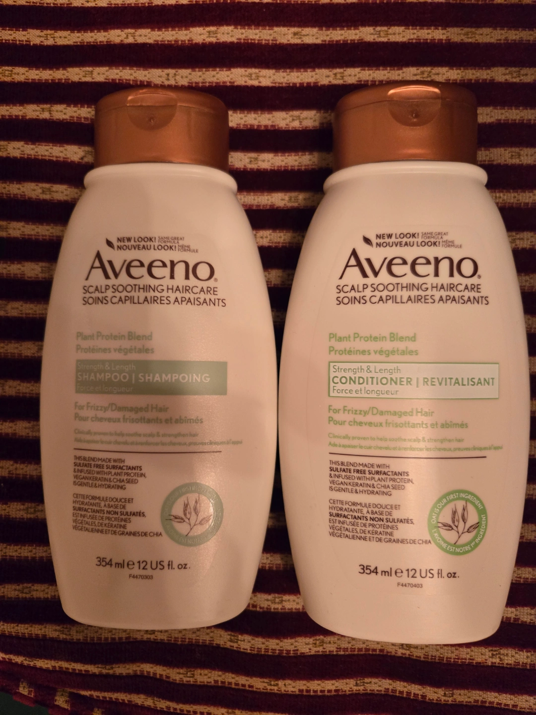 1000+Aveeno scalp soothing haircare shampoo and conditioner. Plant protein blend. Strength and length. For frizzy/damaged hair. Sulfate-free surfactants. Infused with plant protein, vegan keratin, and chia seed. Gentle and hydrating. 354ml each.