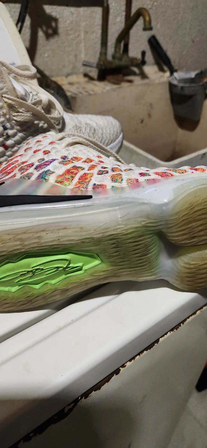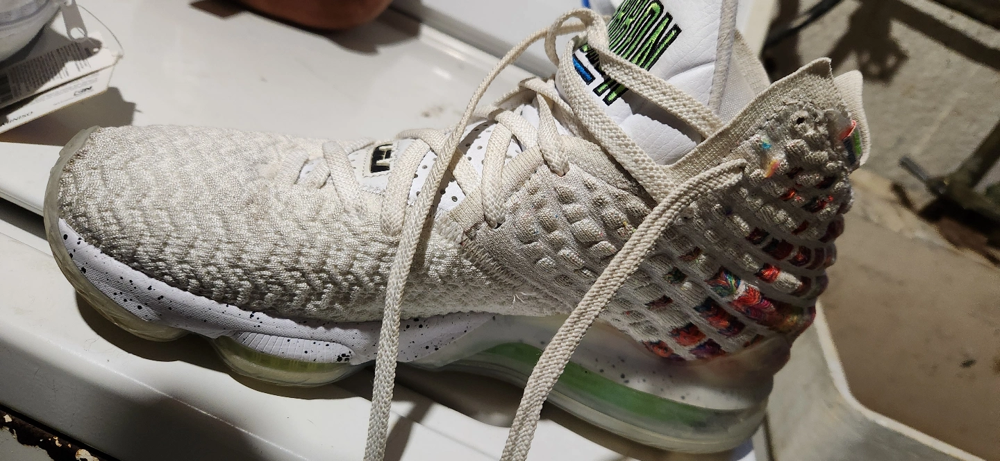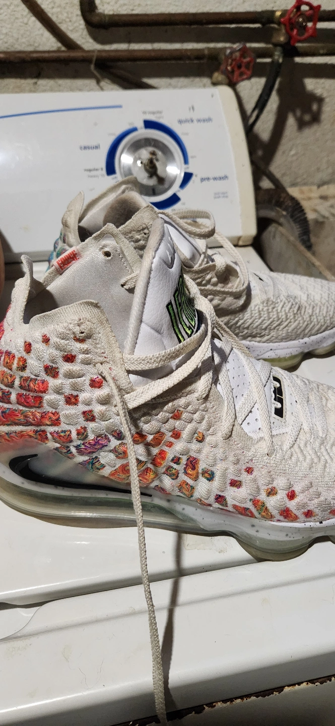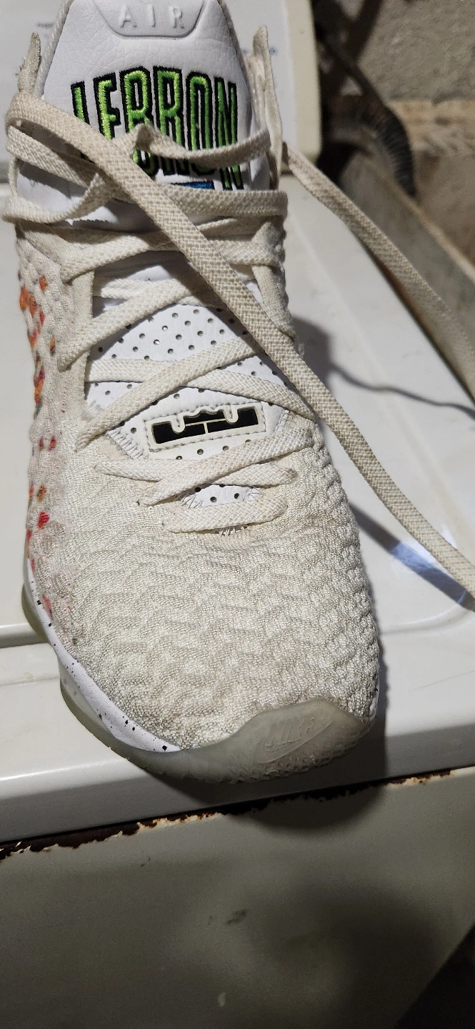 Pre-owned LeBron Witness 5 basketball shoes. White colourway with multicolor accents. Knit upper. Good for casual wear or playing ball.these are a 9 but if u take 8.5 might be tight for someone normally a 9