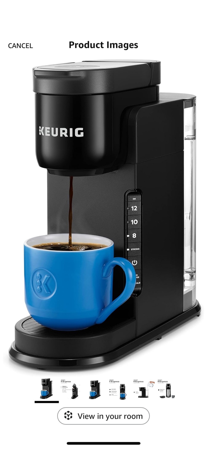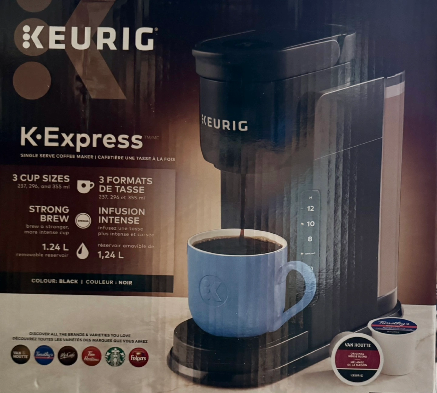 Black Keurig K-Express single serve coffee maker. Makes 3 cup sizes. Features a 42 oz removable reservoir. Brew stronger coffee with the strong brew function.