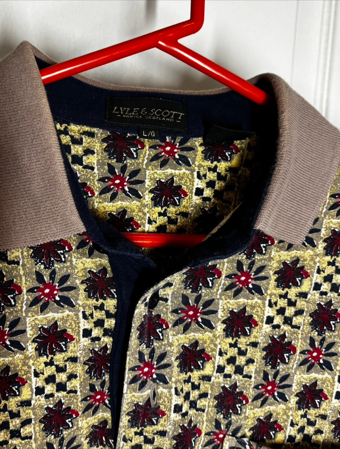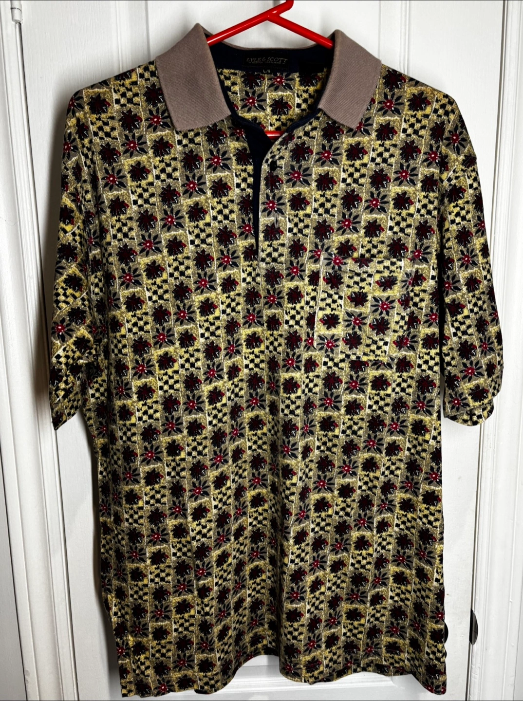 140Men's vintage Lyle & Scott polo shirt. Size L/G. Short sleeves. Unique patterned design. Collared. Pickup in Richmond Hill