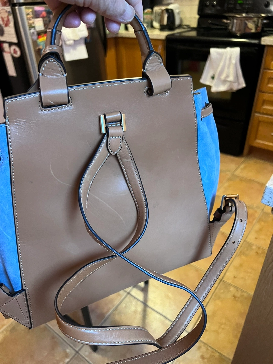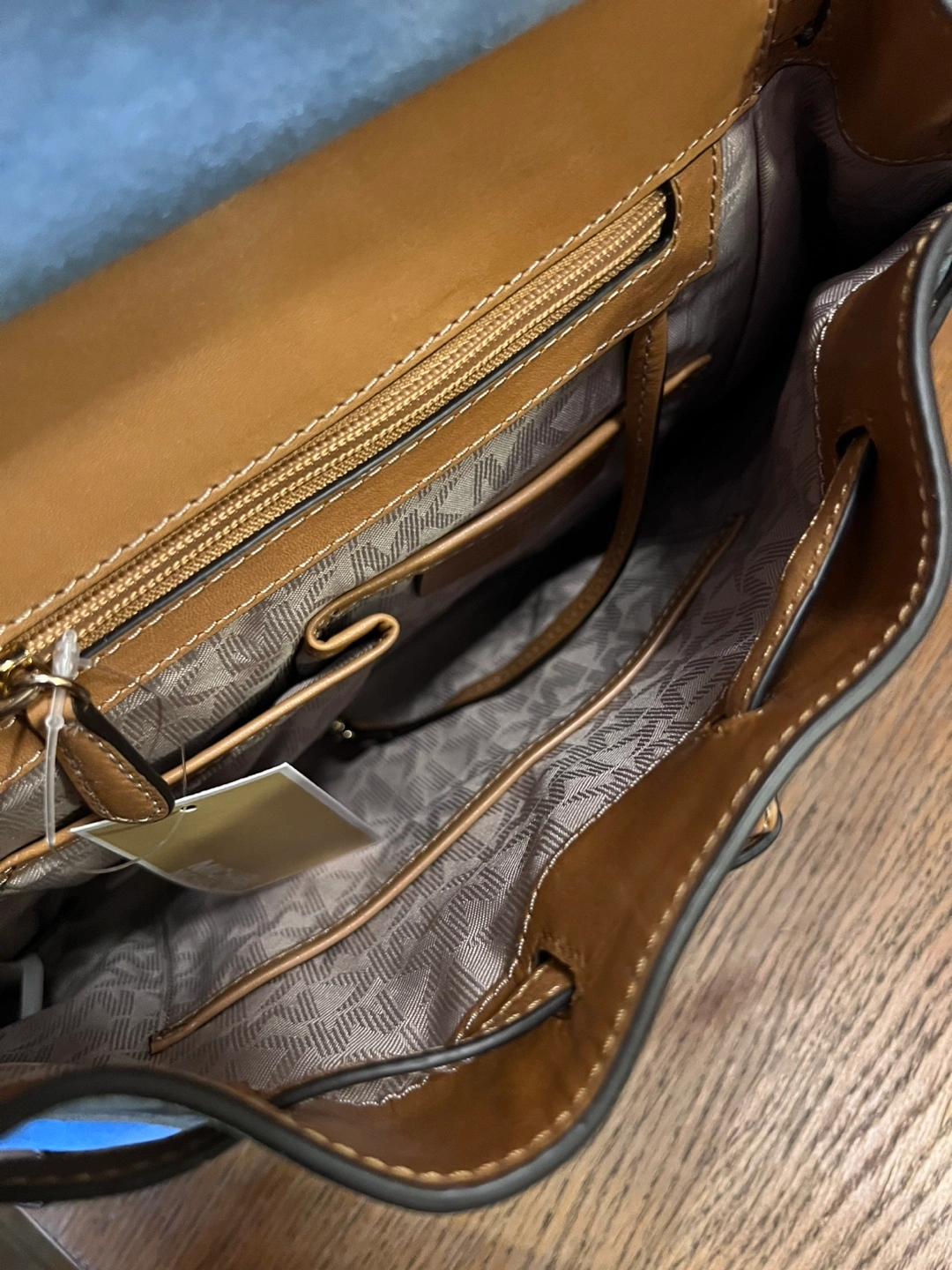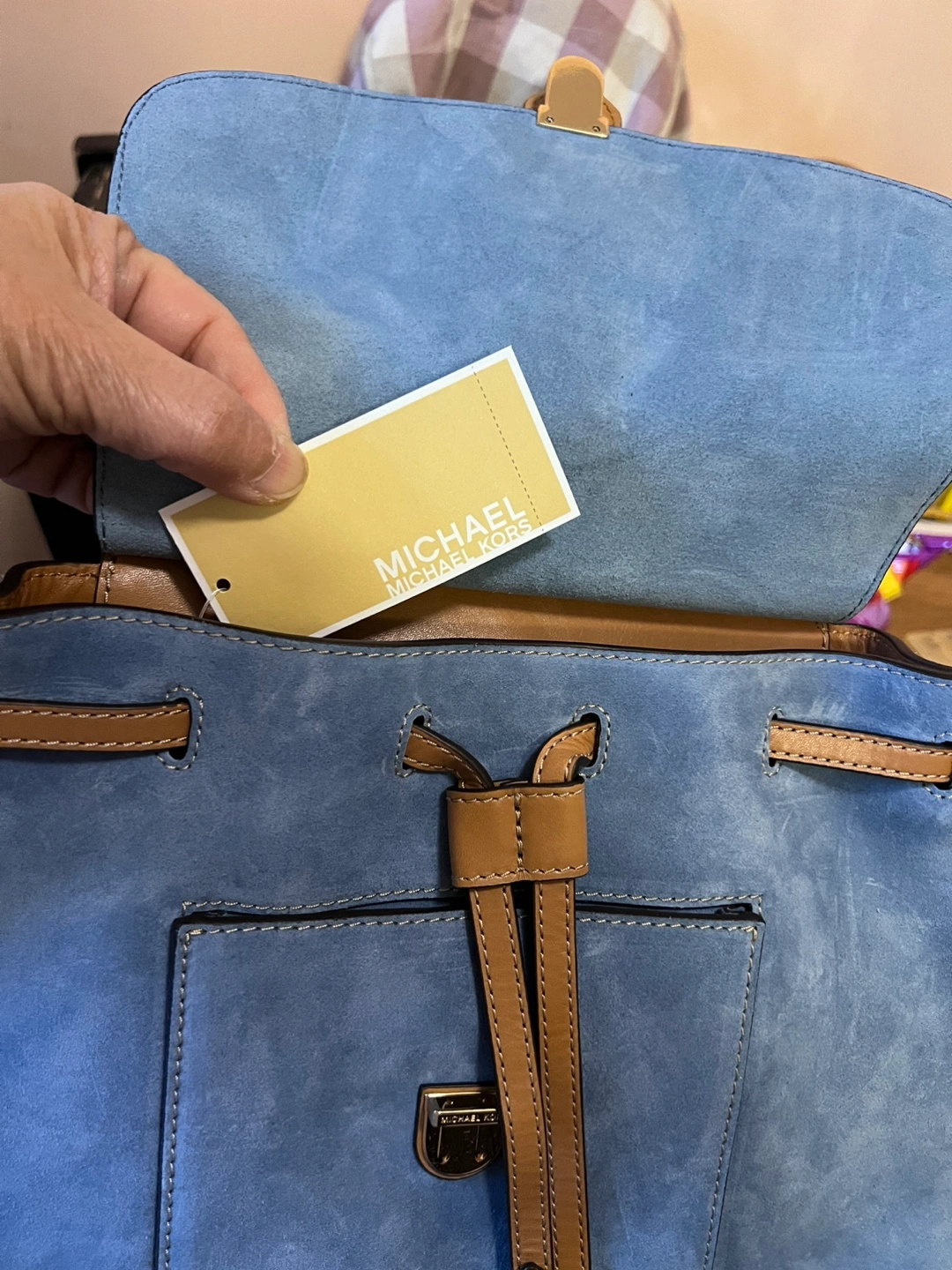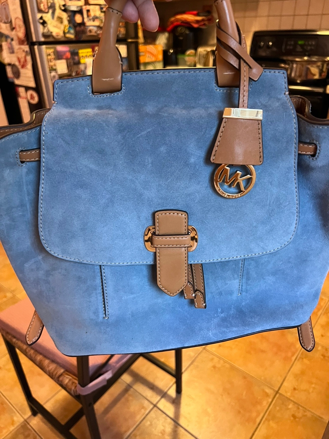 Beautiful Michael Kors backpack. Features blue suede and tan leather. Drawstring closure and adjustable straps. Multiple pockets inside. Excellent condition. Perfect for school, office or travel or simply hanging out with friends.