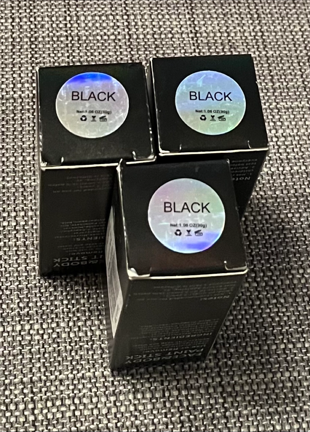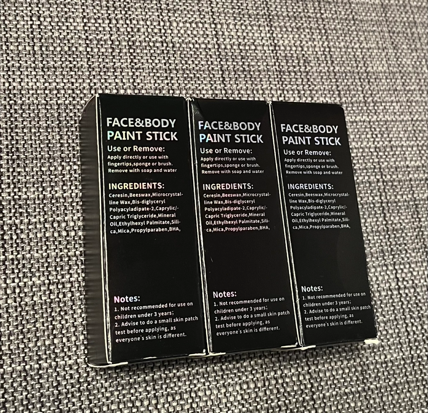black face and body paint sticks. Each stick contains 1.05 oz (30g). Suitable for use on the face and body. Apply directly or use with fingertips, sponge or brush. Remove with soap and water. Not recommended for use on children under 3 years. Advise to do a small skin patch test before applying, as everyone's skin is different.
