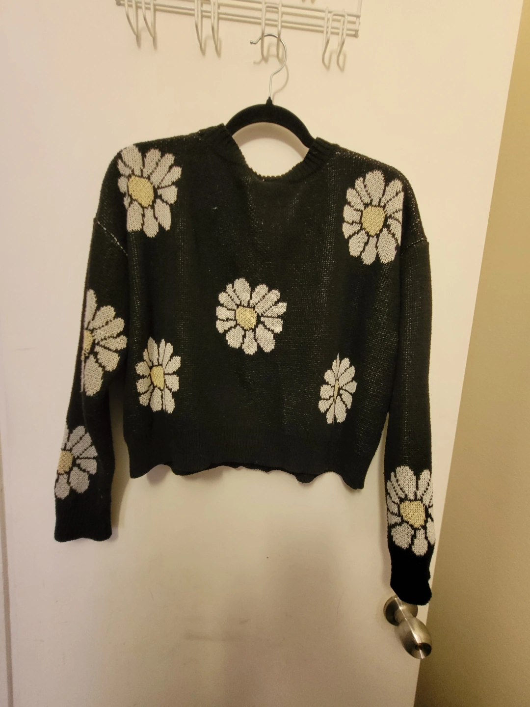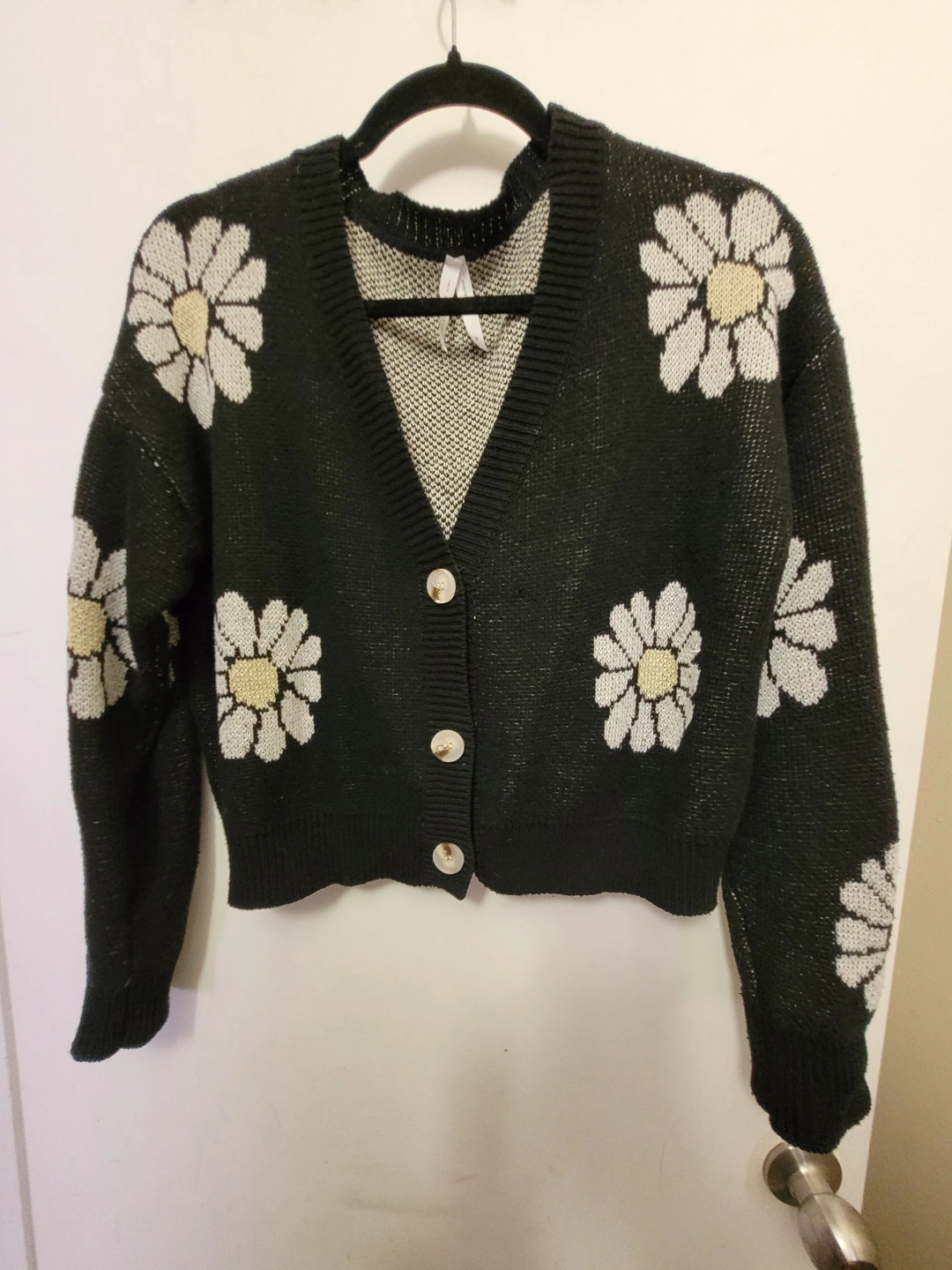 Cute cropped cardigan featuring a black knit with embroidered white daisies. Button closure. Long sleeves. Great for spring.PICK UP @ Gerrard St East and Sherbourne St. No return or exchanges . All sales final!!
