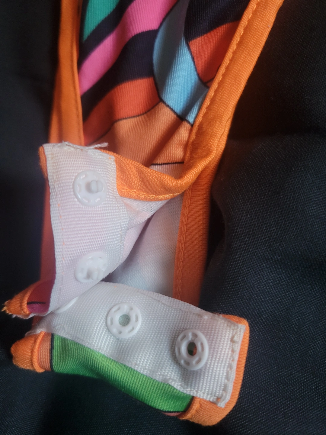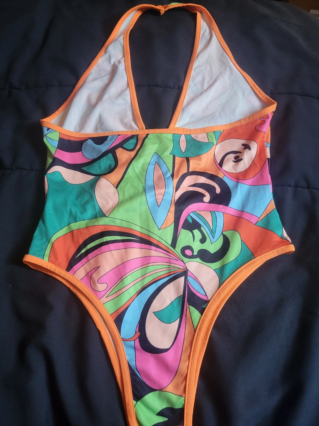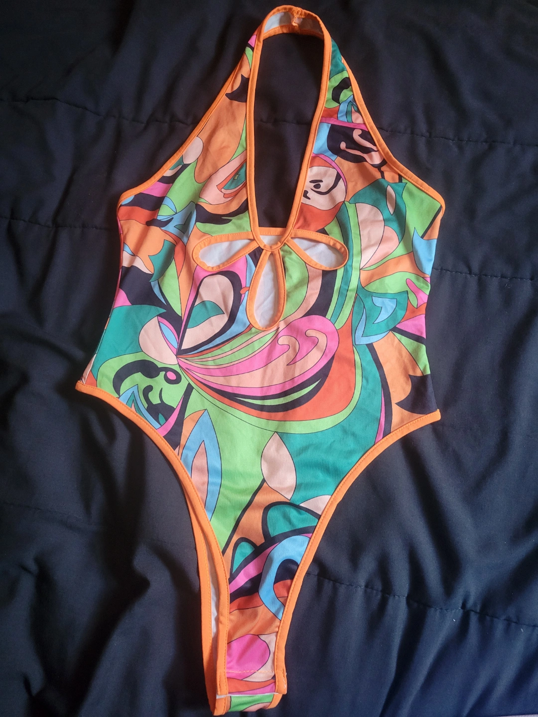 Spice up your summer wardrobe. Vibrant colours. Unique 70s-inspired print. Halter neck and high-leg cut.
