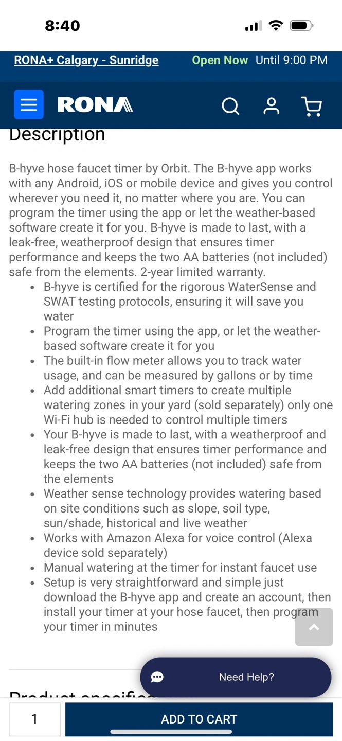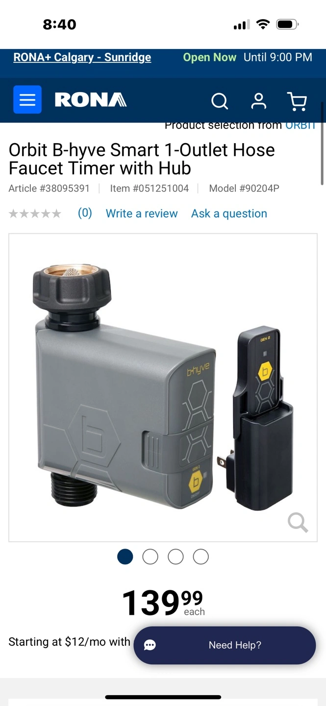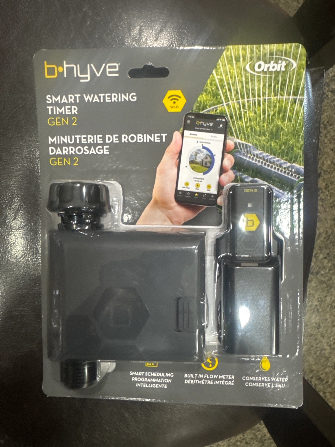 Smart watering timer. One outlet. Control from your phone using the B-hyve app. Weather-based programming. Two AA batteries (not included). Leak-free design. Includes hub for multiple timers. Two-year limited warranty.