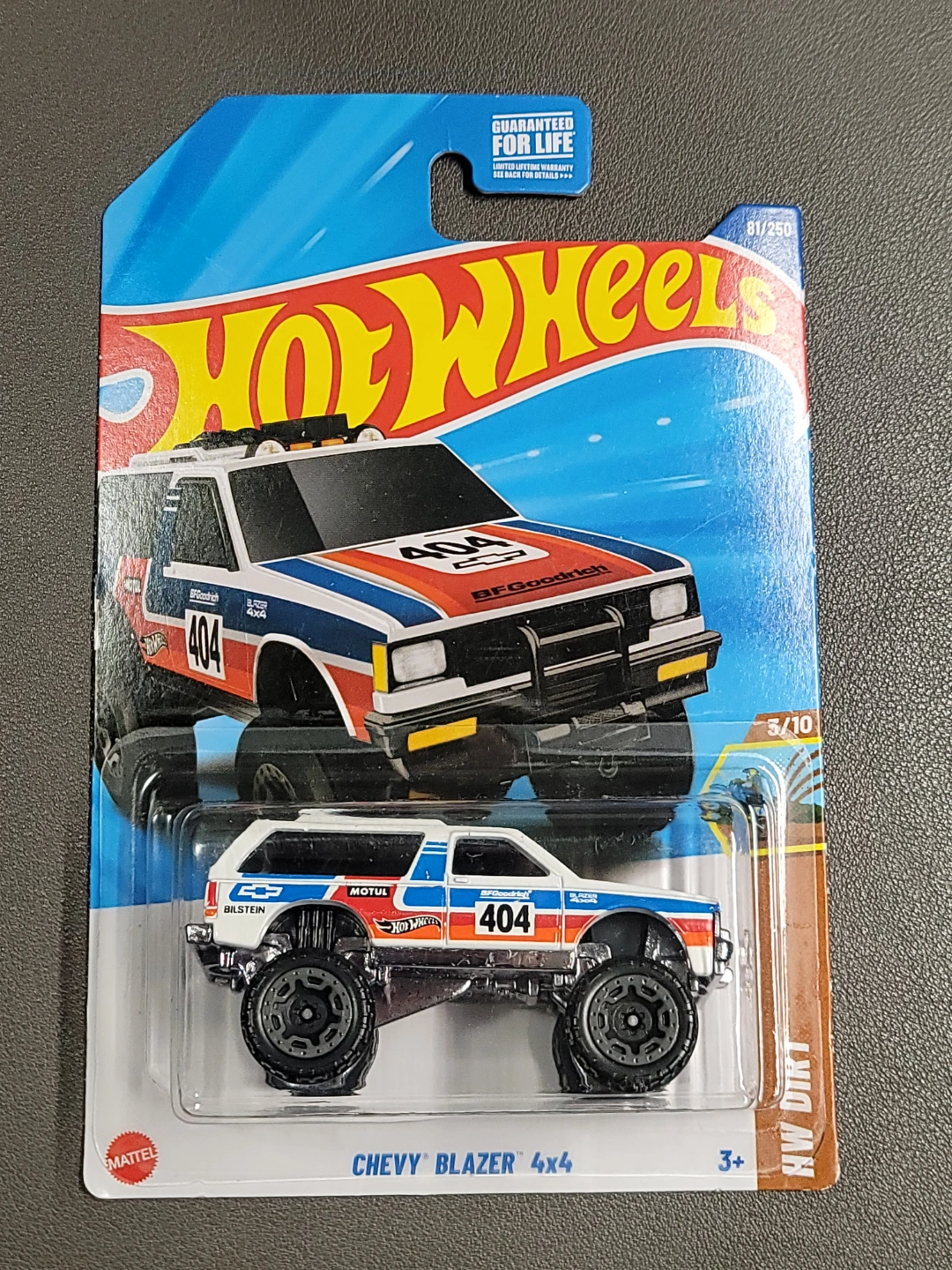 39Collectible Hot Wheels car. Chevy Blazer 4x4. Part of the HW Dirt series. Number 81/250. Features BFGoodrich and Motul sponsors.