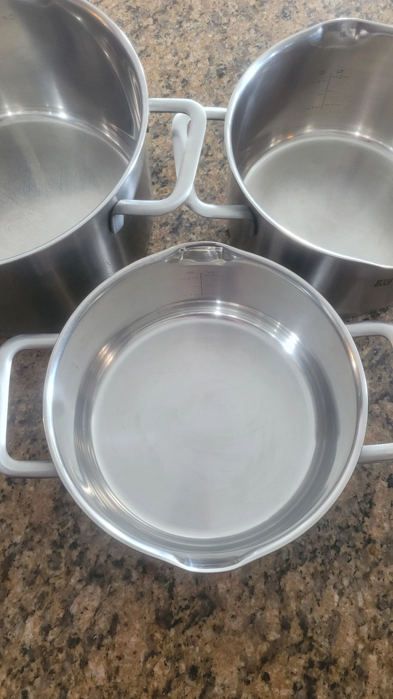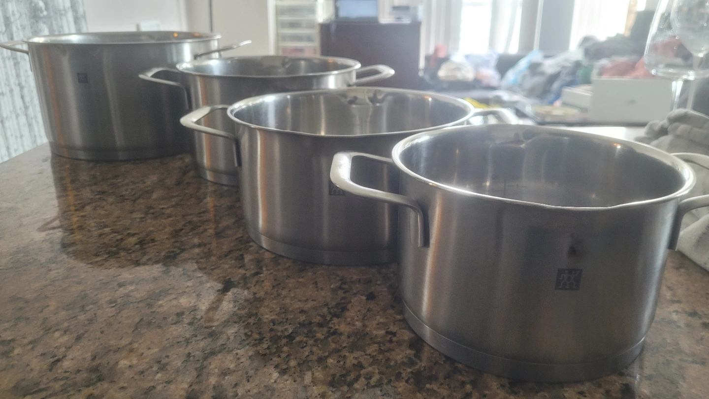 Set of four stainless steel stock pots. Suitable for gas, electric, and induction cooktops. 18/10 stainless steel.