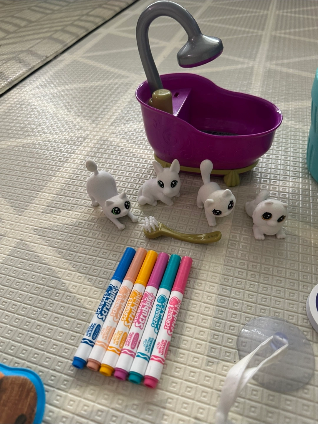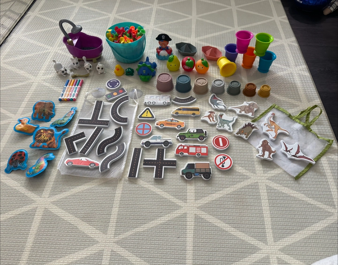 Lots of great stuff here! All in great condition, gently used. We just have an over abundance of water toys. Great for bath tub, or water table play outdoors! Lots of suction toys that stick to tile/side of tub/water tables, bath squirts, a cat & dog crayons scribble scrubby set with all markers and washing brush, a Munchkin light up triceratops… lots of foam dinosaurs and road pieces & cars that stick to side of bath/bathtub tile, etc.