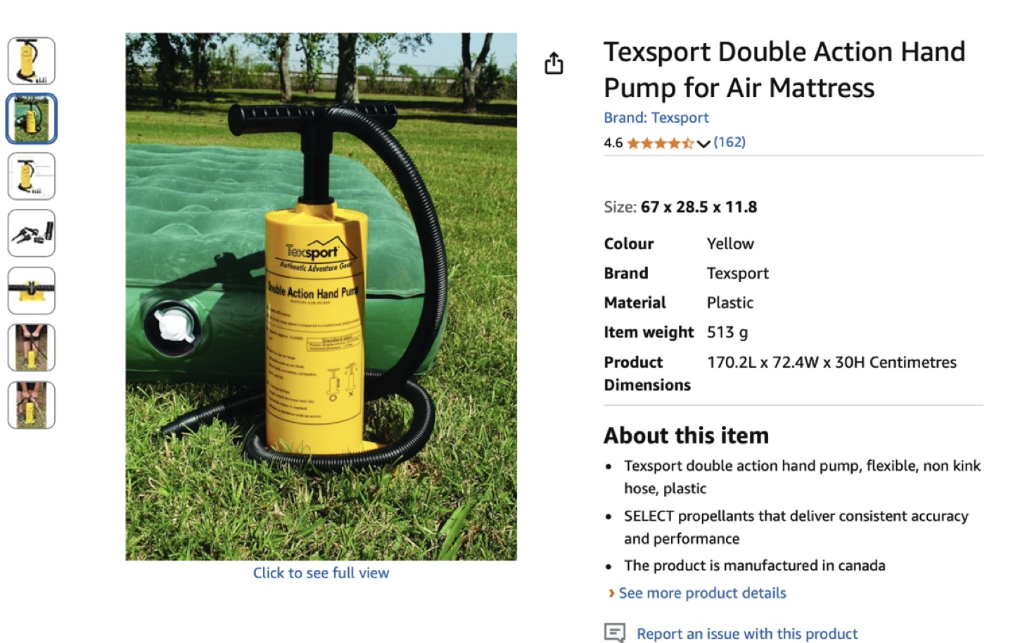 1 / 41 / 4Buy & SellTexsport Double Action Hand Pump for Air MattressTexsport Double Action Hand Pump for Air Mattress$5Yellow double action hand pump. Features a flexible hose. Great for inflating air mattresses and other inflatables. sell for $5ConditionLike newWHERE TO MEETCheck LocationView MapSELLERverifiedporoooMount Pleasant W52547 reviews2 chats·0 favorites·42 viewsSEND CHAT TO SELLERHi porooo! I’m interested in your listing.Hi porooo! I’m interested in your listing.Get the Karrot app to chatSign In to chat