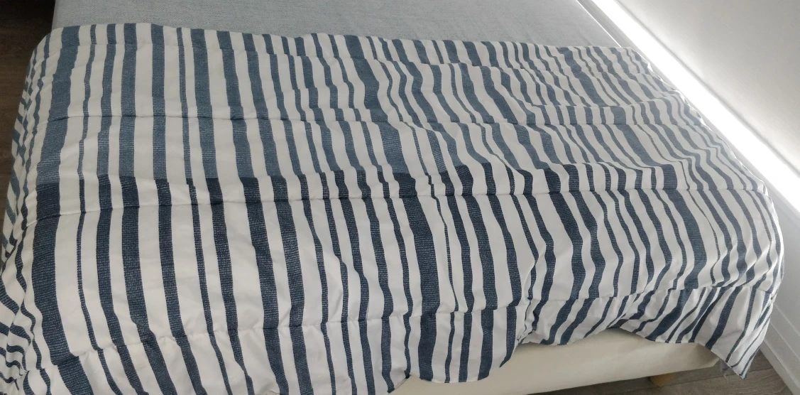 Lightweight duvet, blue and white stripes. Good condition. Machine washable. Few lints on the non-stripes side.
