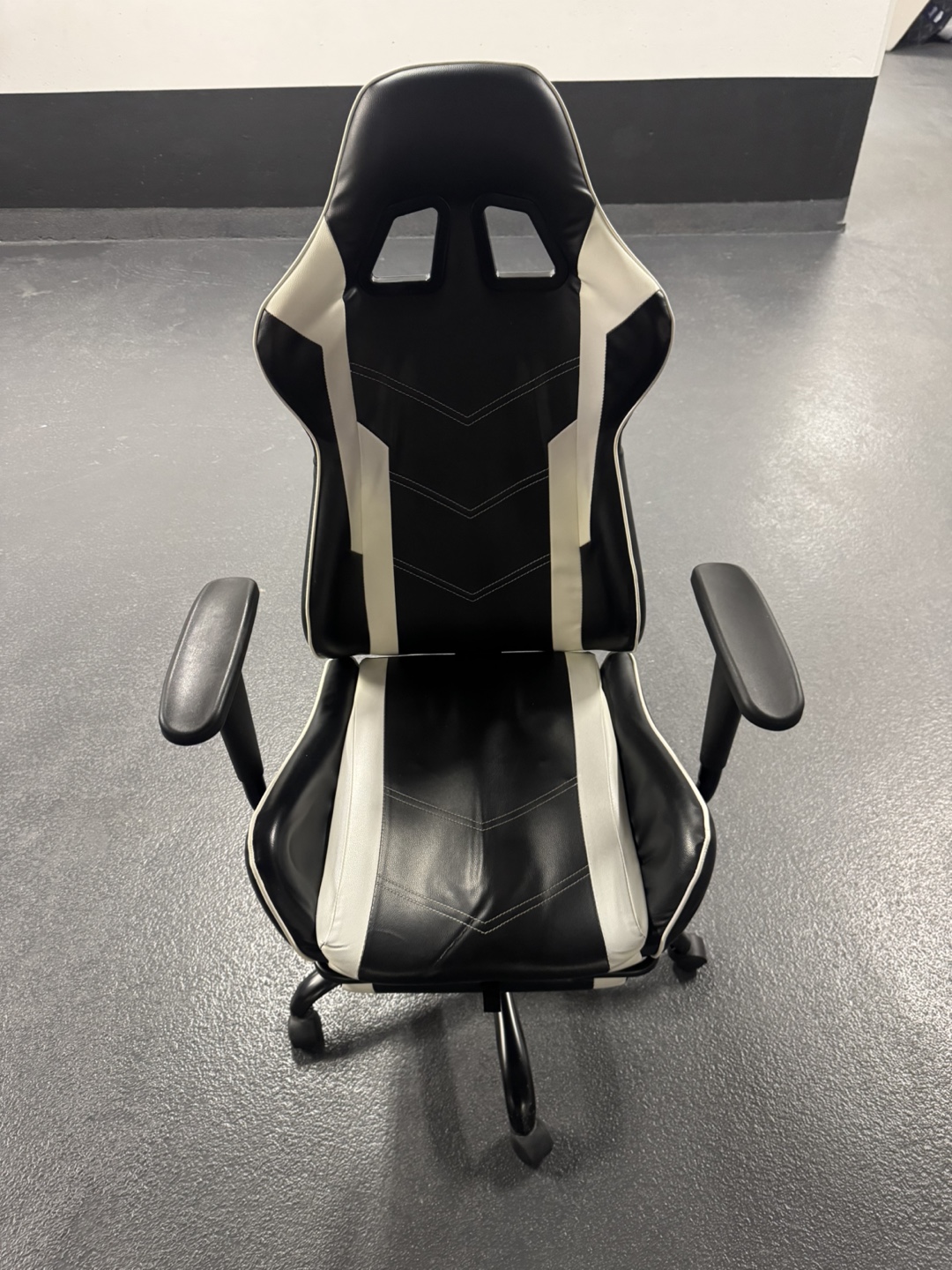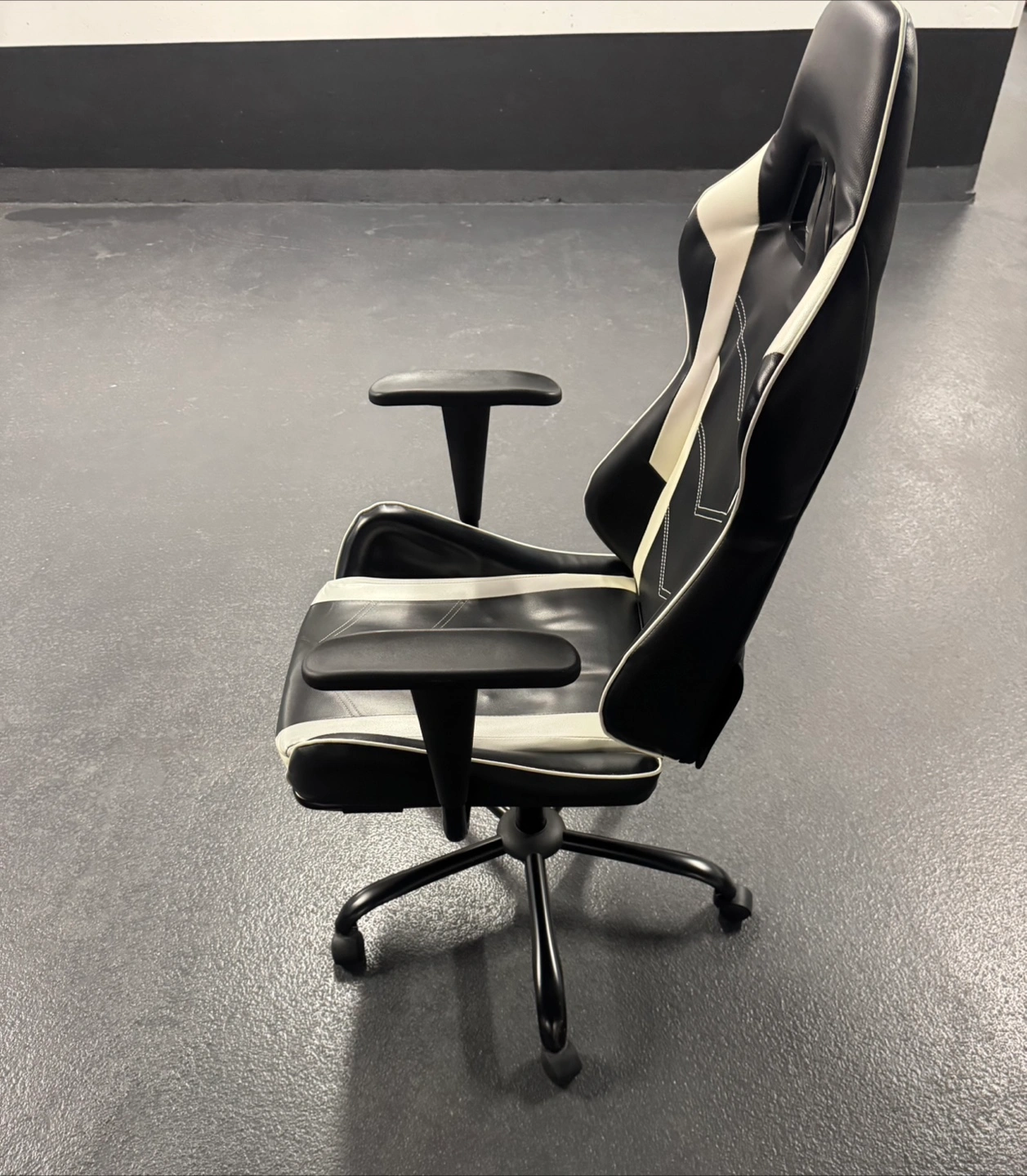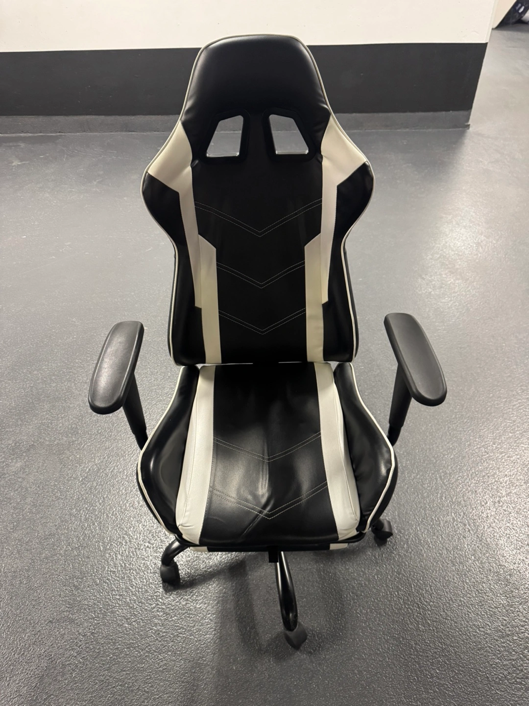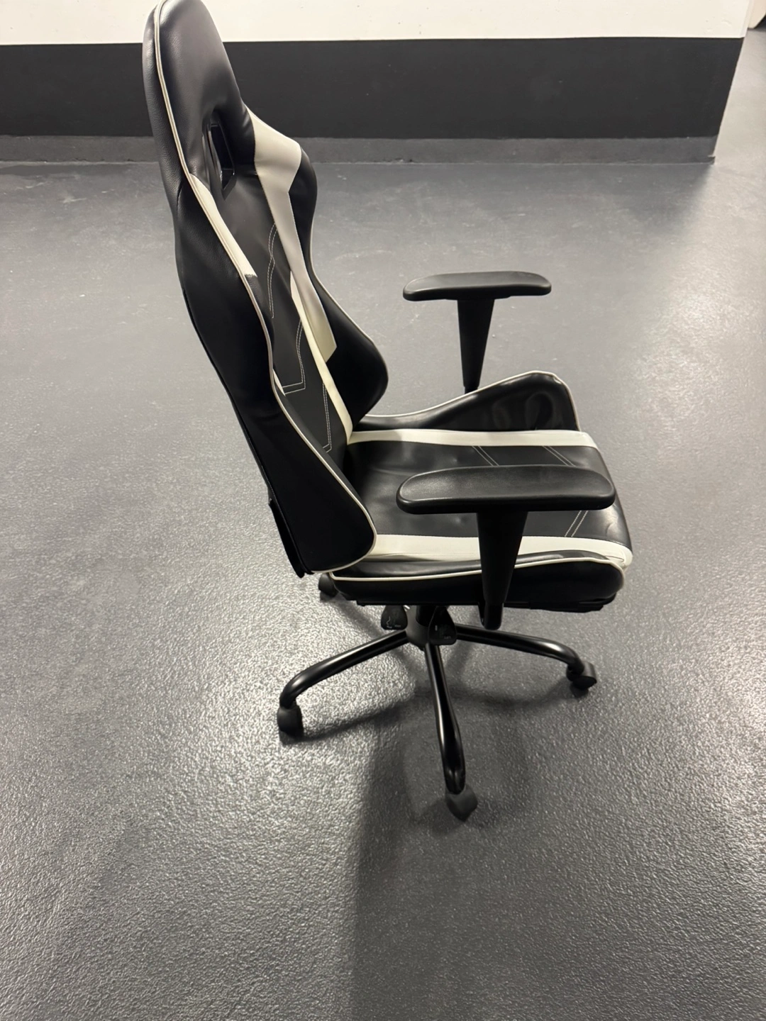Comfortable gaming chair. Features a black and white design. Includes adjustable height and armrests. Lumbar support. Five-star rolling base.
