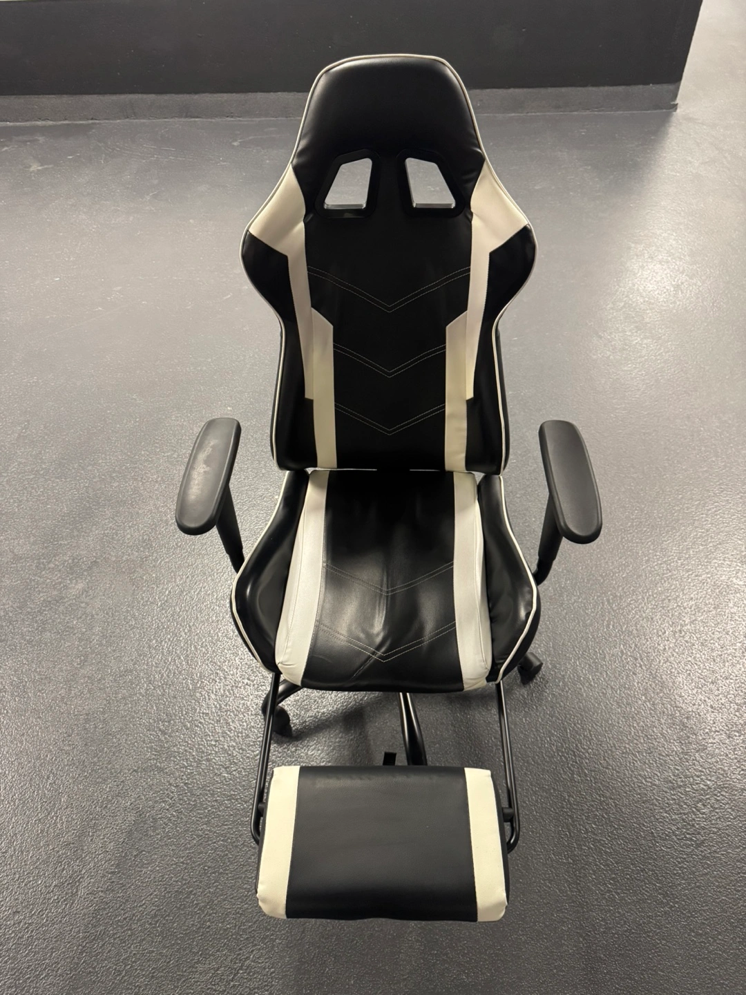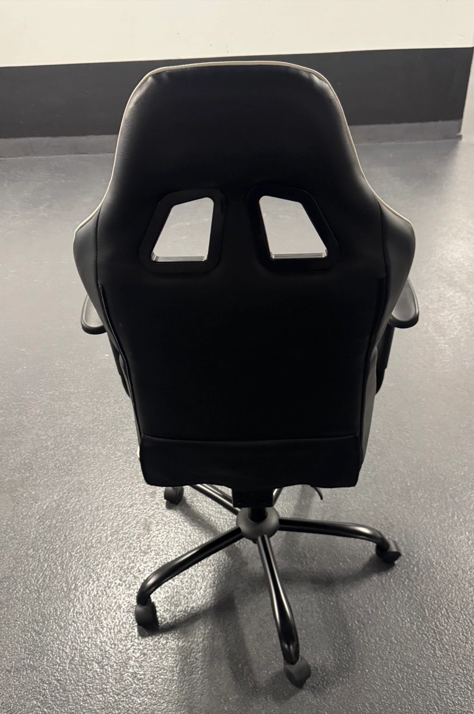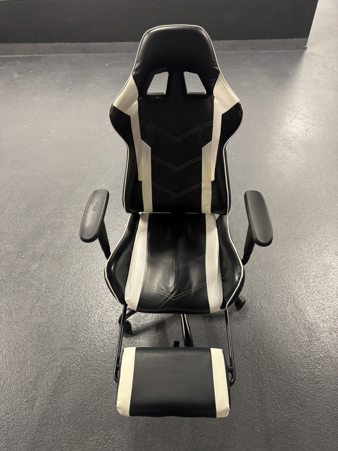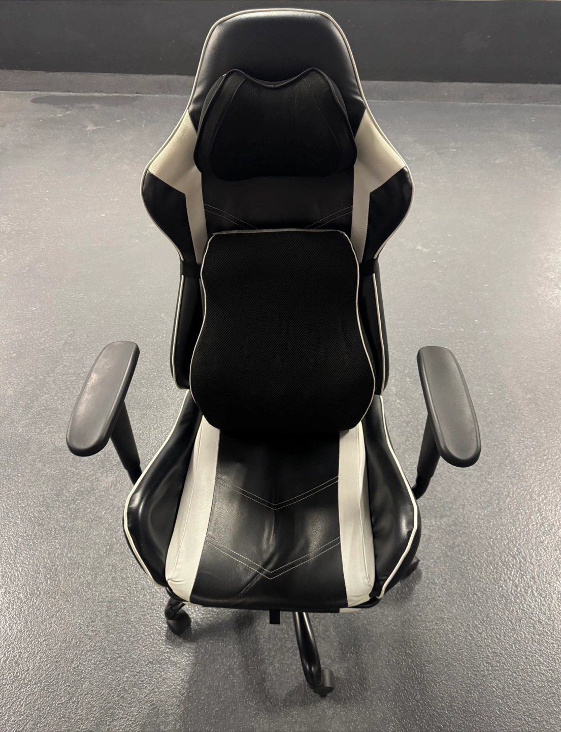 Comfortable gaming chair. Features a black and white design. Includes adjustable height and armrests. Lumbar support. Five-star rolling base.
